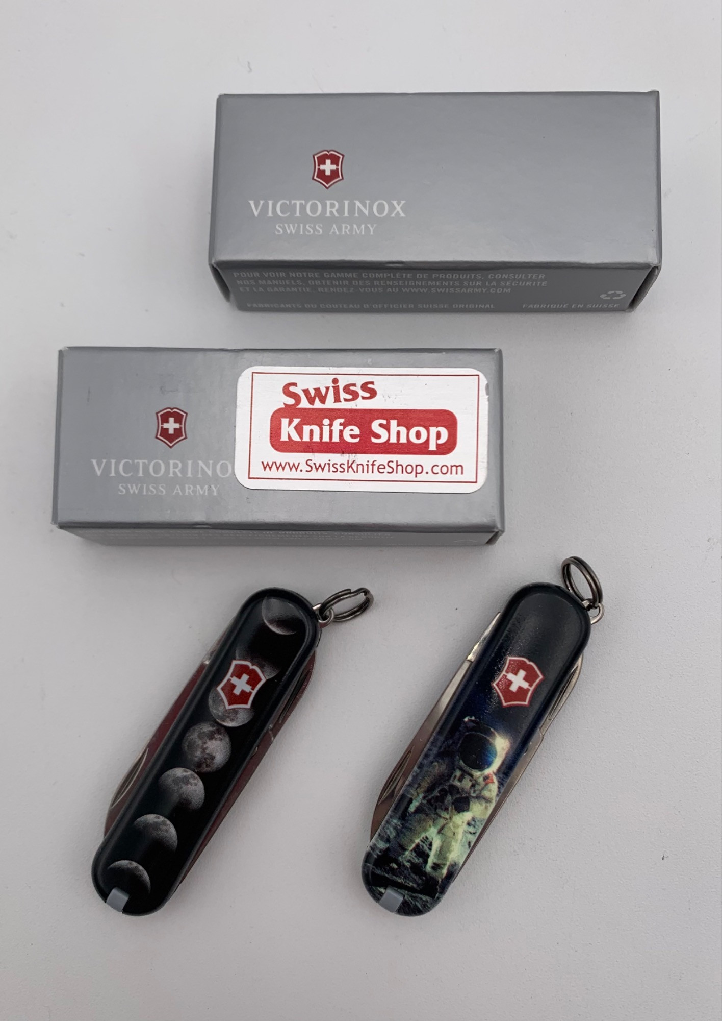 Victorinox logo in red. Reverse shows the lunar landscape and the earth behind.