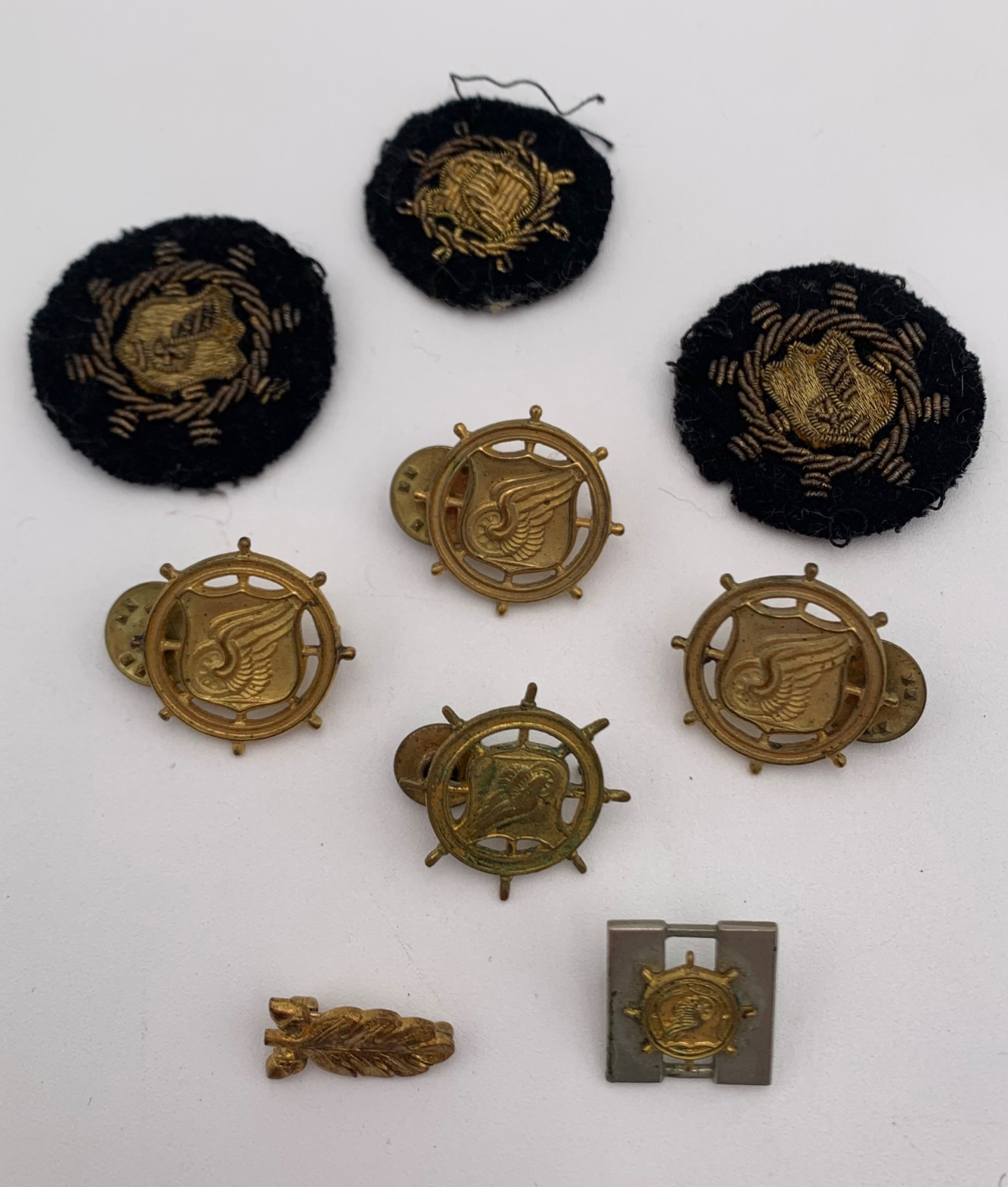 Group of vintage pins & patches. 4 US Army Transportation Corps insignia pins in gold-tone. In