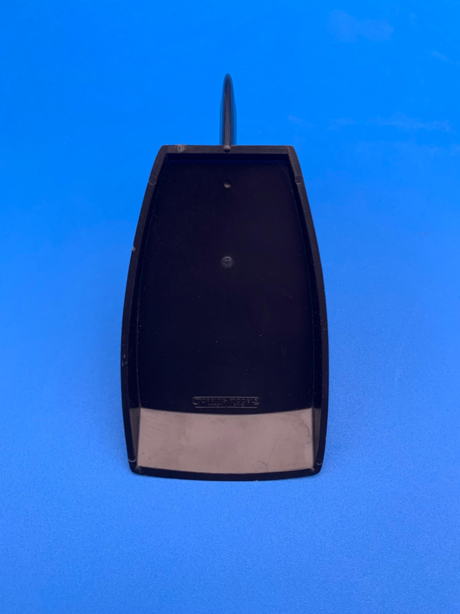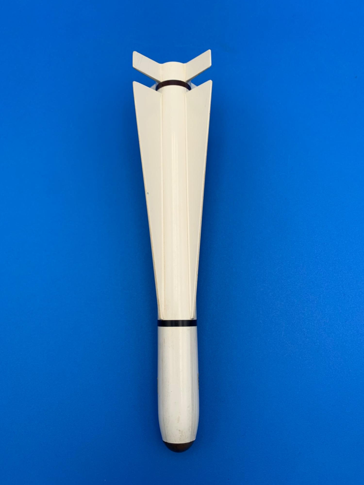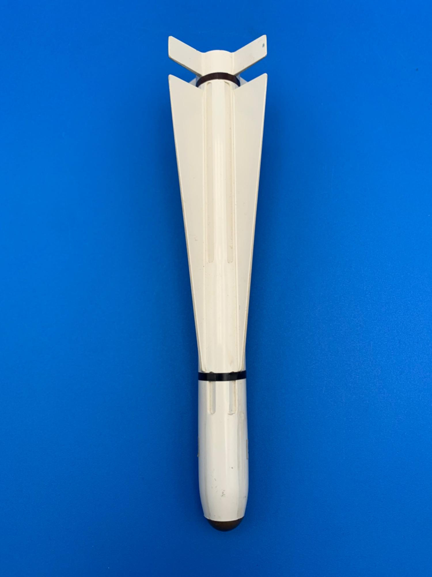 Base is black plastic single pillar curved mount to base of missile with white