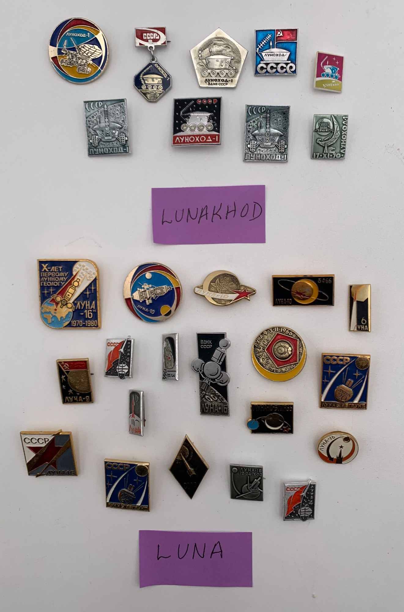 of these are slightly different with pairings of countries and/or dates These two sets of pins were labeled “Luna” and “Lunakhod”. 28 of the 29 pins are metal (the smallest one is plastic) and all have pinbacks. The largest measures 1.25” H. Please see