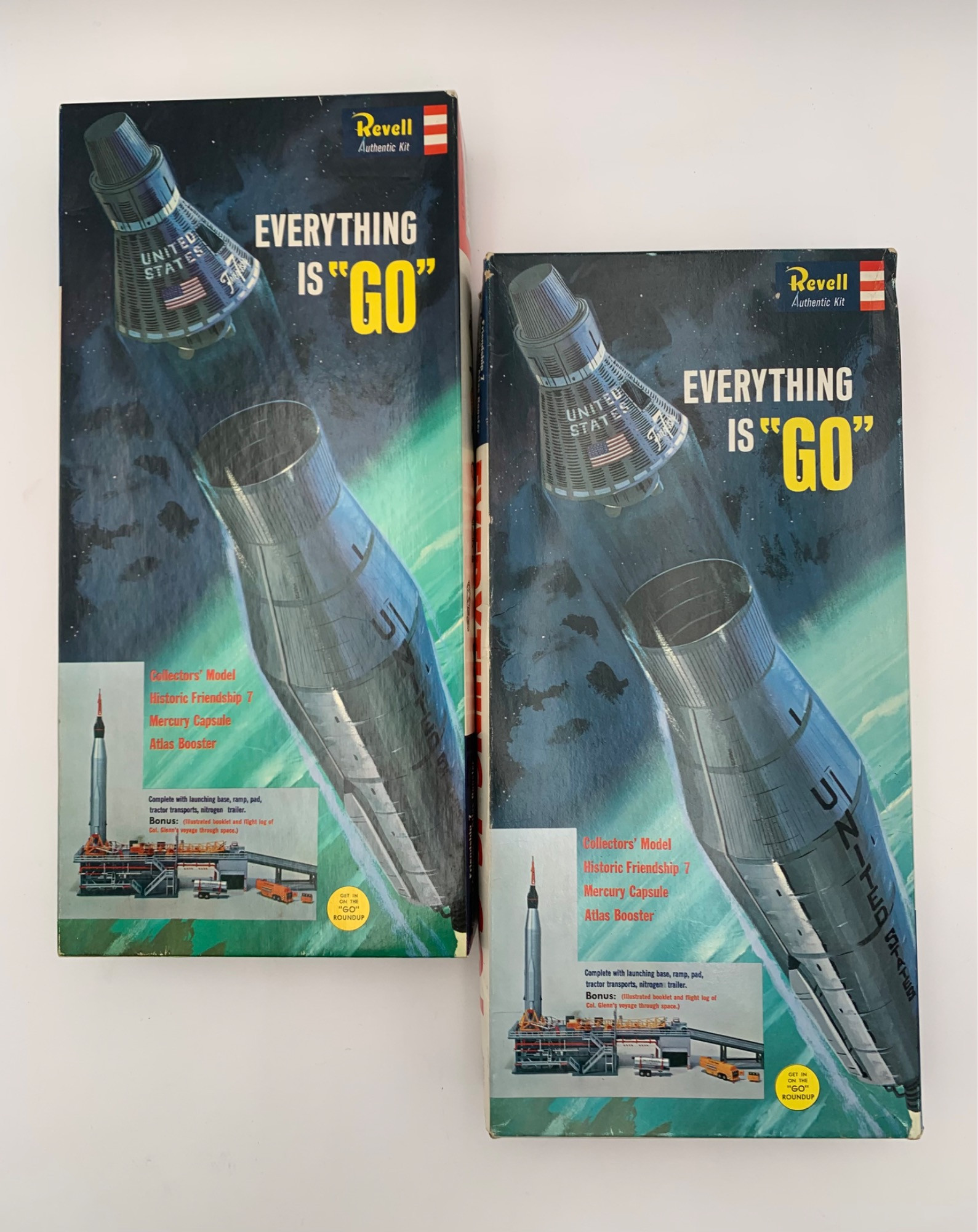This model kit from Revell salutes John Glenn & his Friendship 7 Mercury Capsule & Atlas Booster. The original set is from 1962. It looks to be complete with many of the pieces still in original plastic bag packaging. BUT, in case it is not complete, we are adding a second identical kit (manufacture date of 1969) in case something is missing from the first kit. Model numbers are slightly different: H-1833-249 & H-1833-250, but the exterior of the boxes are identical and they appear to be identical parts, too, so we are guessing they are the same. Please see photos for details.