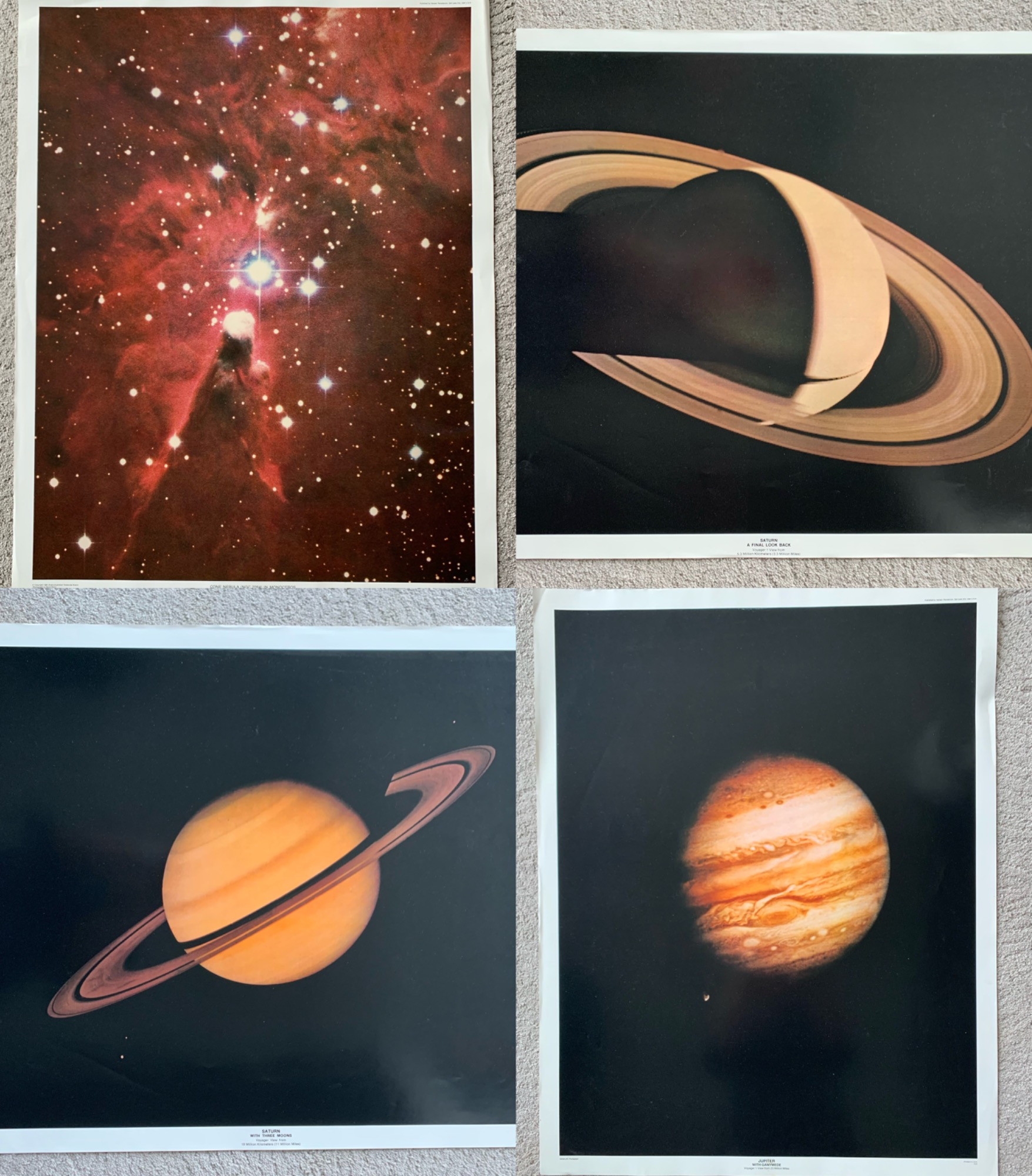 Quartet of classic posters published by the Hansen Planetarium (Utah). All measure 29" H x 22.5" W and all are in good shape with a semi-glossy surface. There are occasional creases/ripples/etc. as they have been used, but they appear not to have been handled a whole lot. There are pinholes in the "Saturn, a final look back" poster. Please check the photos out for yourself. BONUS: Earth at Night poster from 1985. In ok shape - has seen more use than the above posters. Measures 23" H x 35" W.