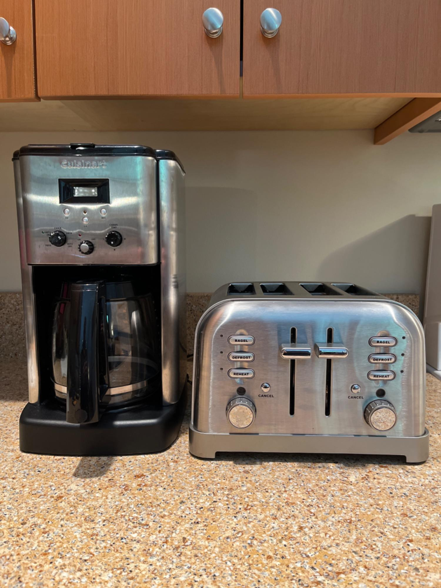 Cuisinart Coffee Maker & Cuisinart 4-Slice Toaster Cuisinart coffee maker w/ programmable timer & adjustable carafe temp 7 1/2”W x 7 1/2”D x 14”H Cuisinart 4-slice toaster w/ bagel, defrost & reheat settings 10 1/4”W x 10”D x 7 1/2”H