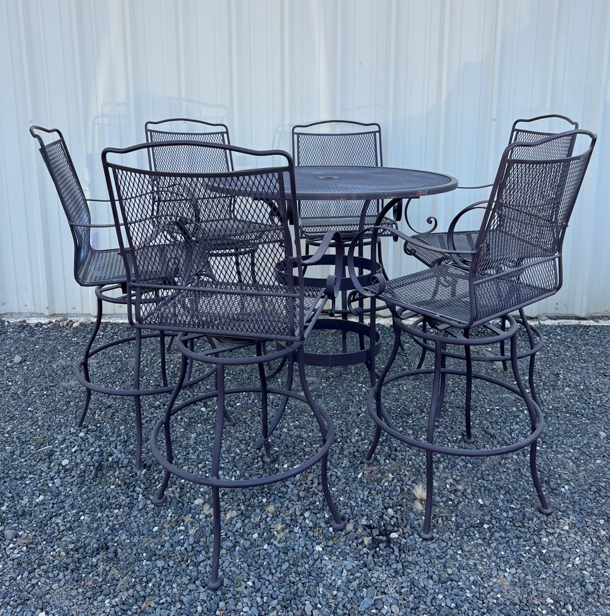 Wrought Iron Patio Bistro Set w/ 6 Swivel Chairs Chairs - 22 5/8”W x 24”D x 50 1/2”H seat depth - 19” Seat height - 29” Table w/ umbrella hole - Dia: 42” x 42” Table & a few chairs have some rust