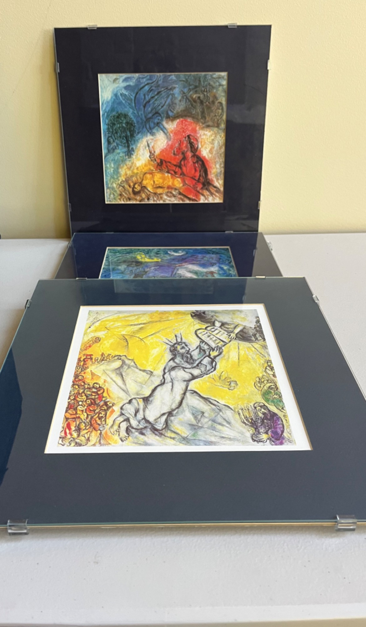 3 Marc Chagall Matted & Framed Prints Acquired from the Marc Chagall Museum in Nice, France Russian-French Modernist artist The Sacrifice of Isaac - 11 5/8” x 11 3/4” Noah’s Ark - 11 5/8” x 11 5/8” Mounting hardware broken Moses Receiving the Tablets of Law - 12 3/8” x 12 3/8”