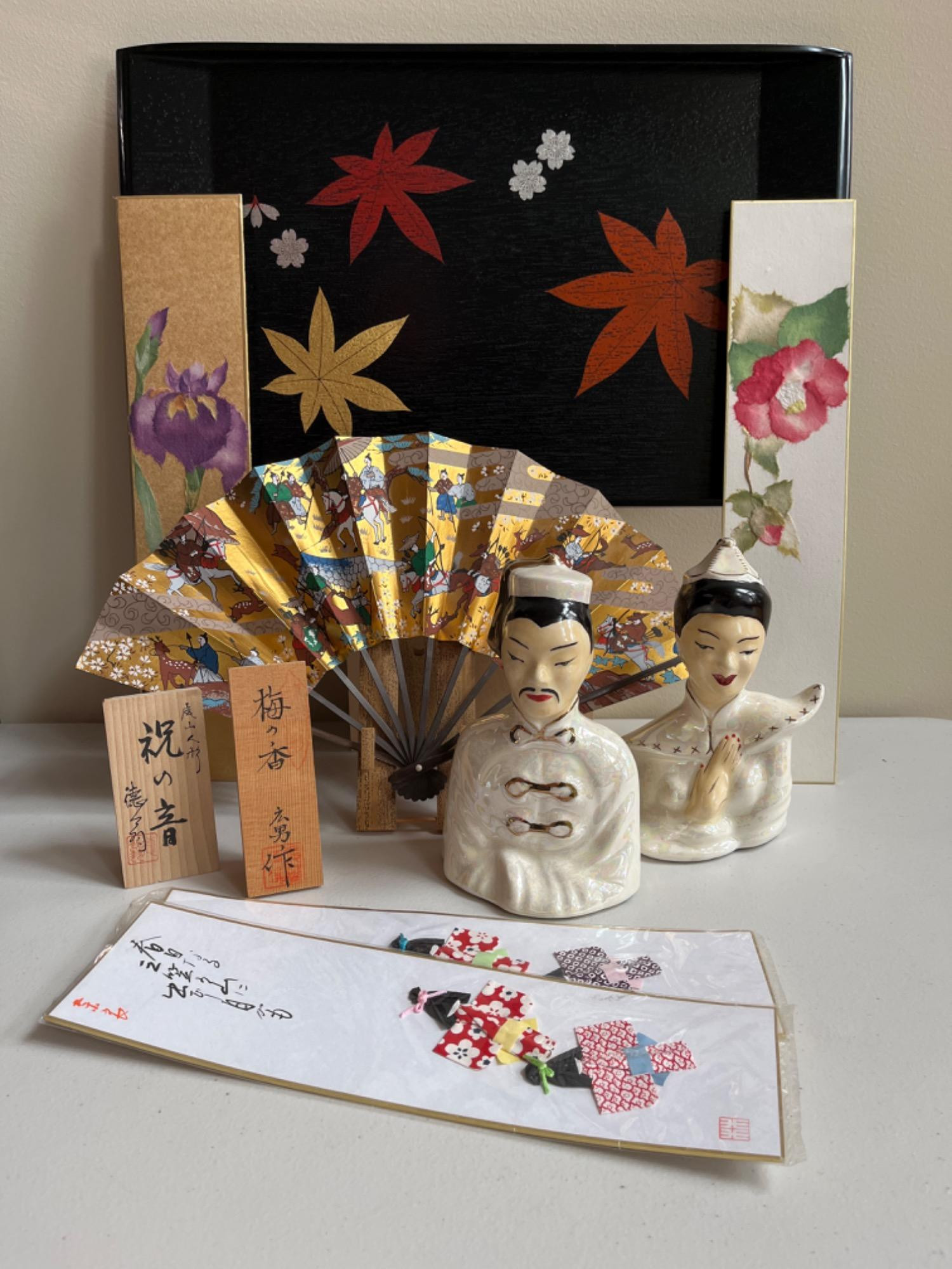 Handpainted Fan on Stand, Wooden Tray, Paper Flowers, Porcelain Busts Handpainted pearlescent Busts Approx. 5”L x 3 3/4”W x 7”H Hand painted Fan - 15 1/4”L x 8 7/8”H 2 wooden signs 2” x 1 3/8”W x 4” 1 9/16” x 1 1/2”W x 4 3/4”H Paper Dolls - dolls are 2 1/2”H x 1 3/4”W Hand made torn paper Flowers - 3” x 14 1/4” x 1/16” thick Wooden Tray w/ Stenciled Leaves 17 3/4”L x 10 13/16”W x 13/16”H