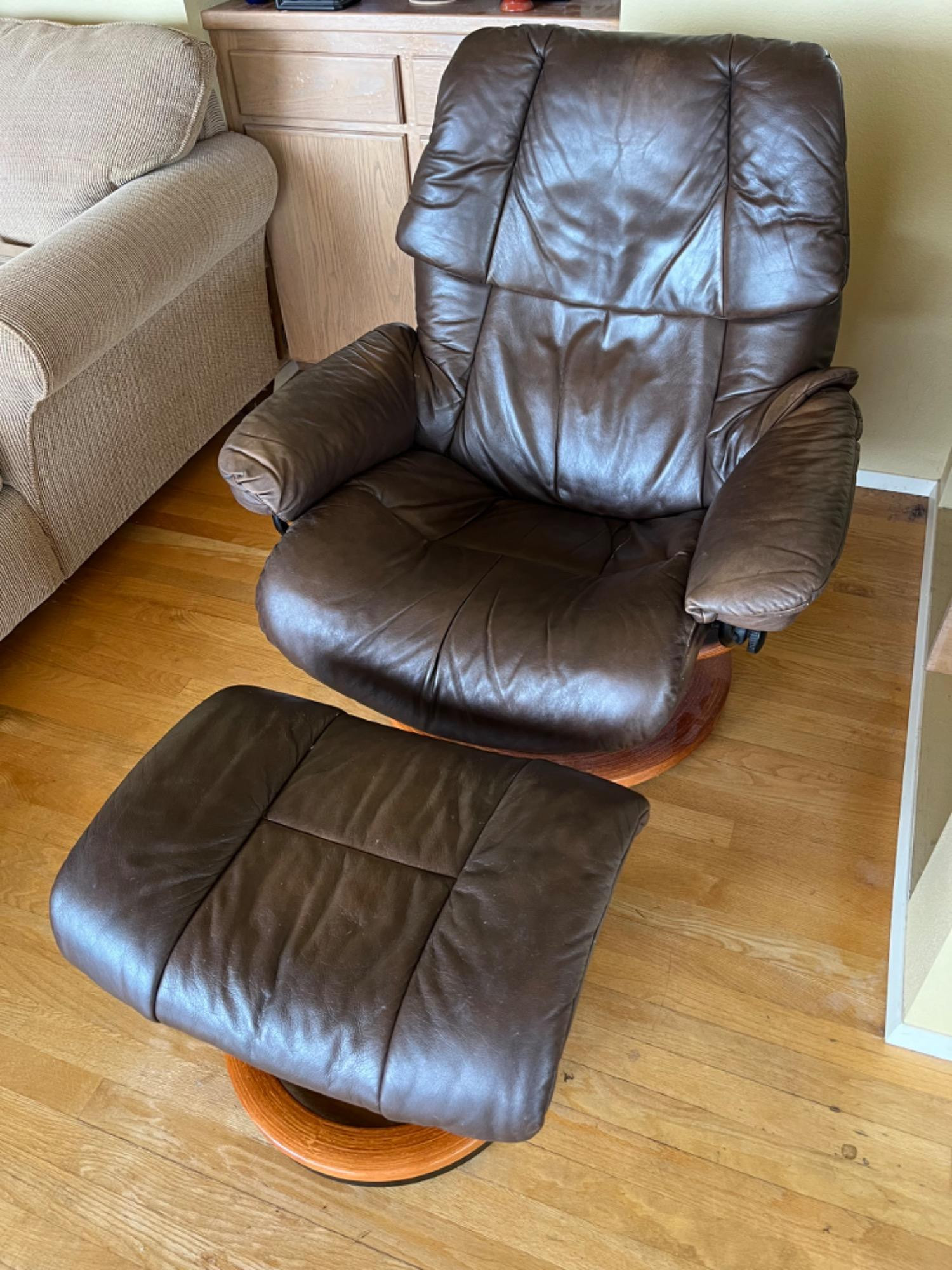 Brown Leather Stressless Chair With Ottoman. Good condition. Chair is 38.5” h x 35” w x 28” d. Fits a larger person. Very comfortable.