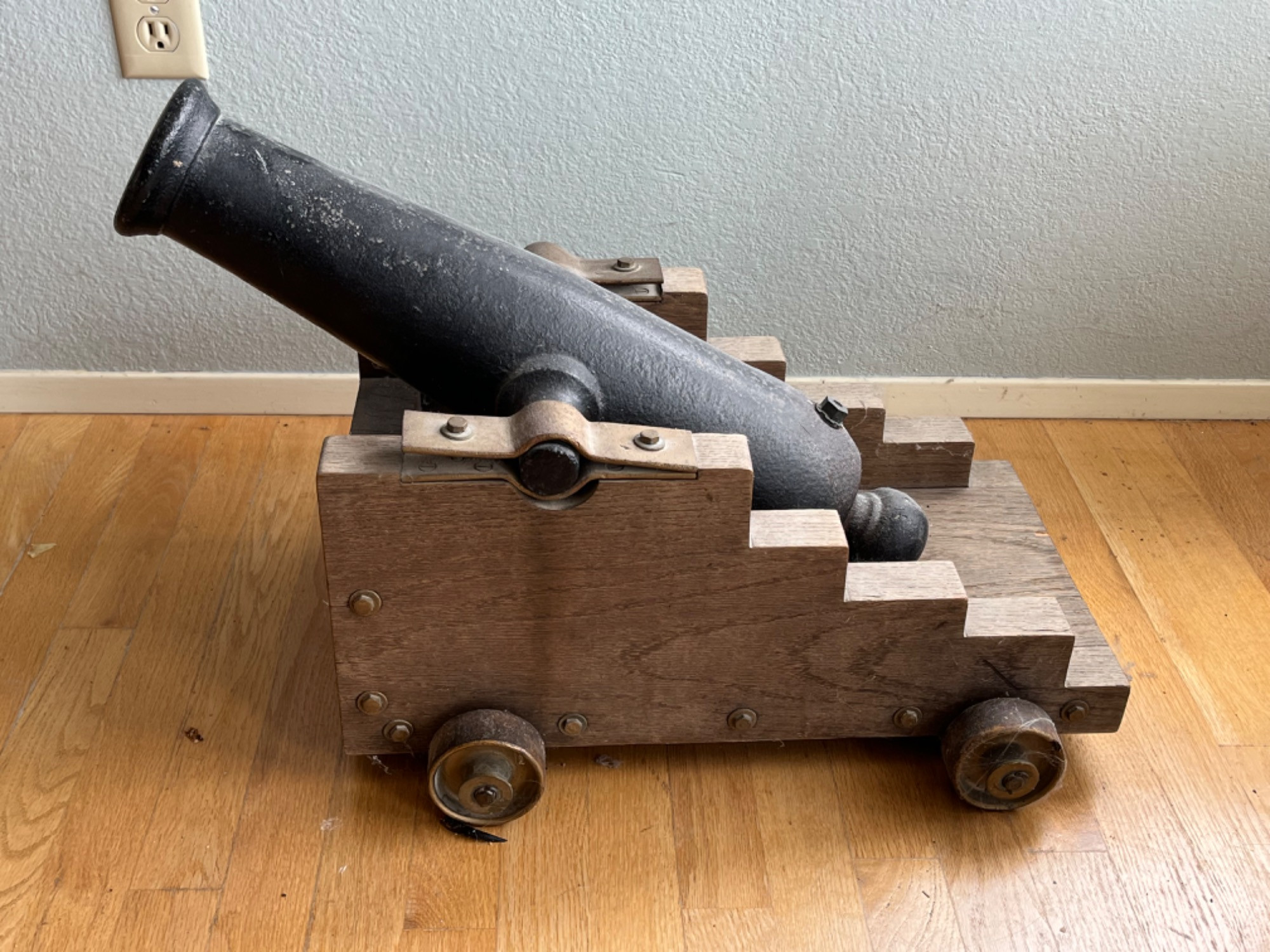 Small Iron Naval Cannon With Wheeled Wood Carriage c. 1800. Heavy! Bring help to move. Antique items offered for auction on the Site are sold “as is”. We endeavor to describe and display the items accurately and truthfully; however, we cannot guarantee the accuracy or reliability of any item’s description or condition. We strongly encourage all bidders to review images, descriptions, and condition reports and to contact us for additional information prior to bidding.