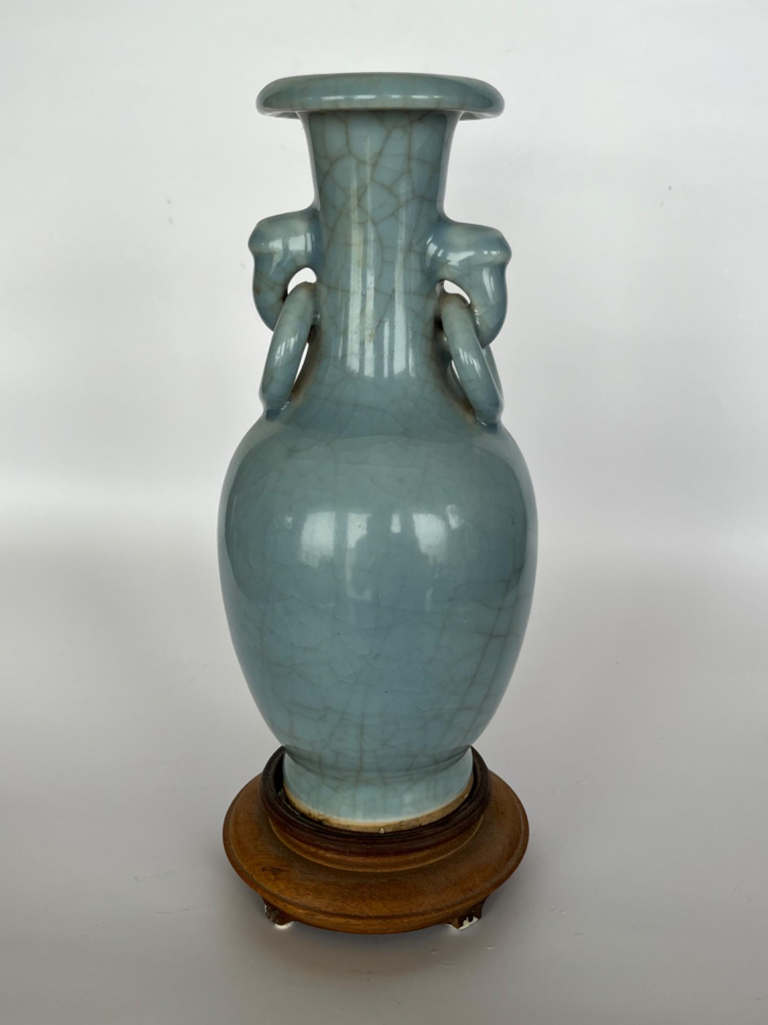 Chinese Celadon Light Blue Crackled Asian Vase-Jump Rings. 20th Century. Comes with stand. Crazing throughout. Antique items offered for auction on the Site are sold “as is”. We endeavor to describe and display the items accurately and truthfully; however, we cannot guarantee the accuracy or reliability of any item’s description or condition. We strongly encourage all bidders to review images, descriptions, and condition reports and to contact us for additional information prior to bidding.