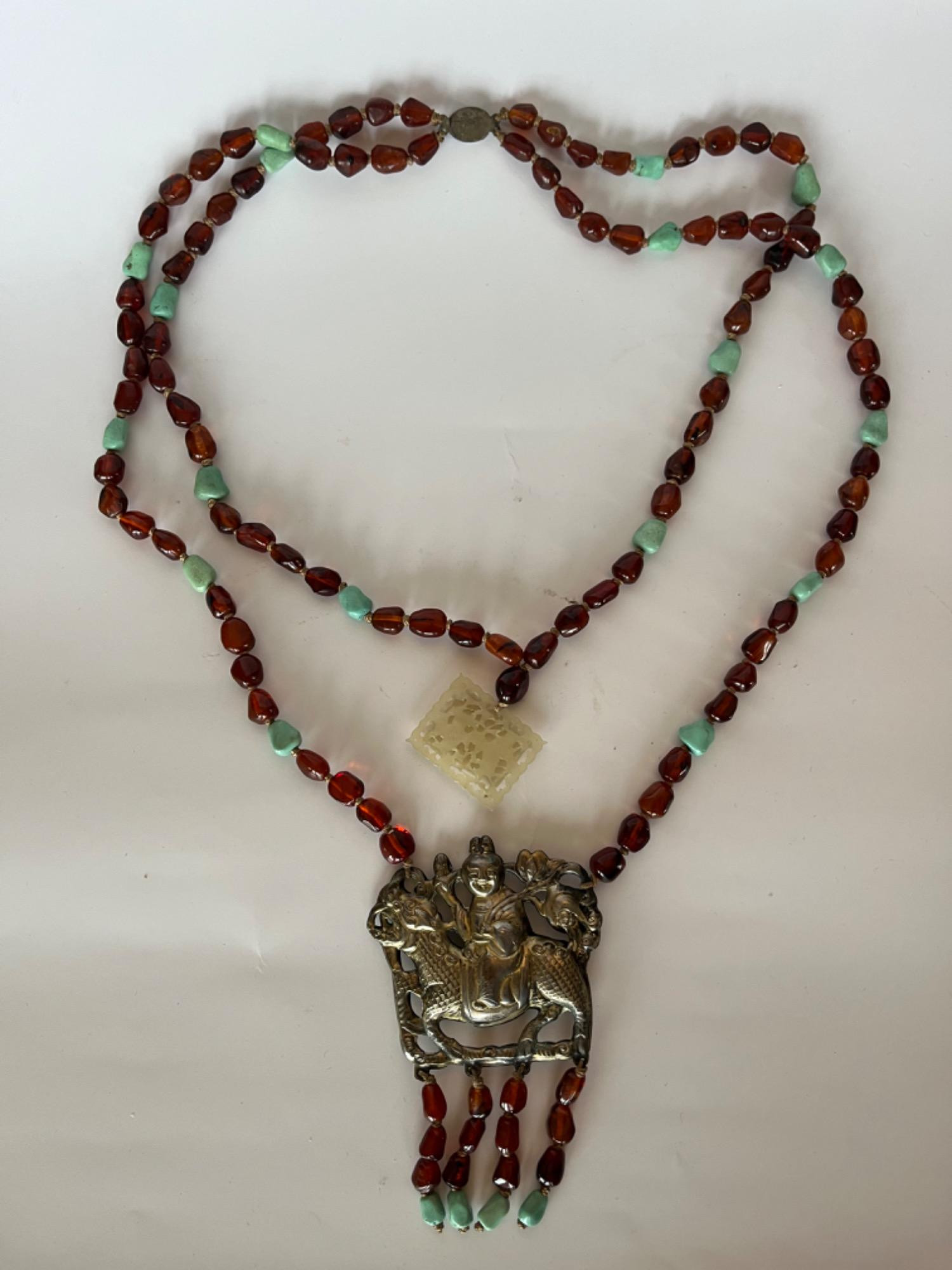 Chinese Silver Toned, Jade, Amber & Turquoise Wise Man Dragon Necklace. 28” necklace.