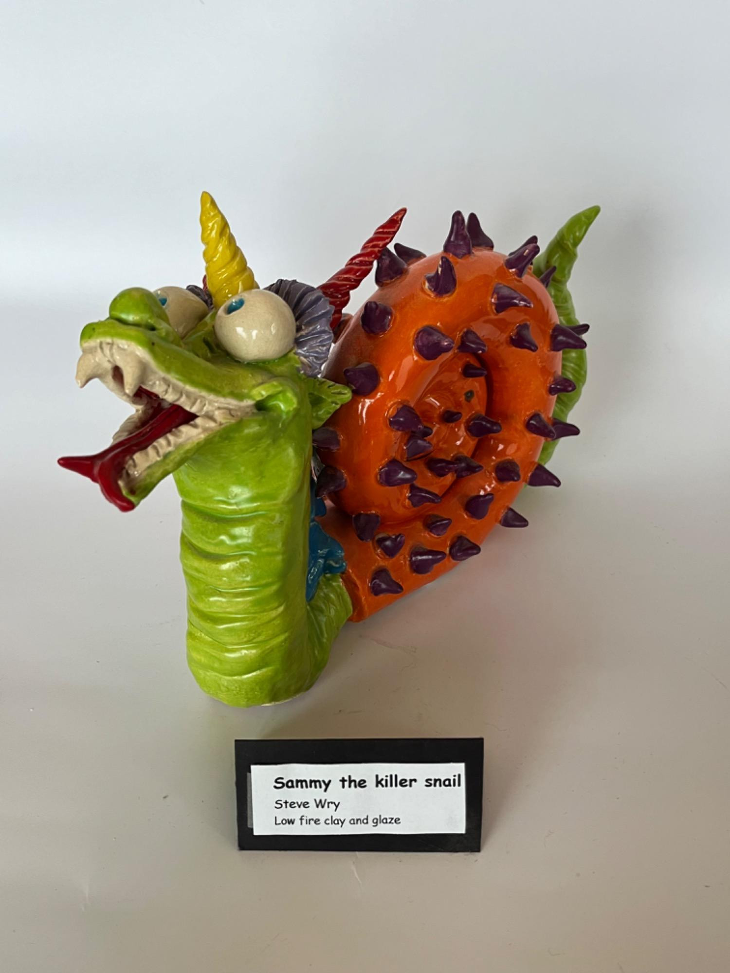 Steve Wry “Sammy the Killer Snail” Art Pottery. To bring such clay creations into existence Stephen uses a variety of techniques which include throwing, hand building and coiling. To finalize his figures he uses gas & electrical firings but also Raku, Soda and Pit firings or a combination of them in order to have each piece reach its potential. Such skills he has mastered due to attending California State University in Fullerton, where he majored in ceramics under Jerry Rothman. He also minored in Art History and graduated with a B.A. in Fine Arts.