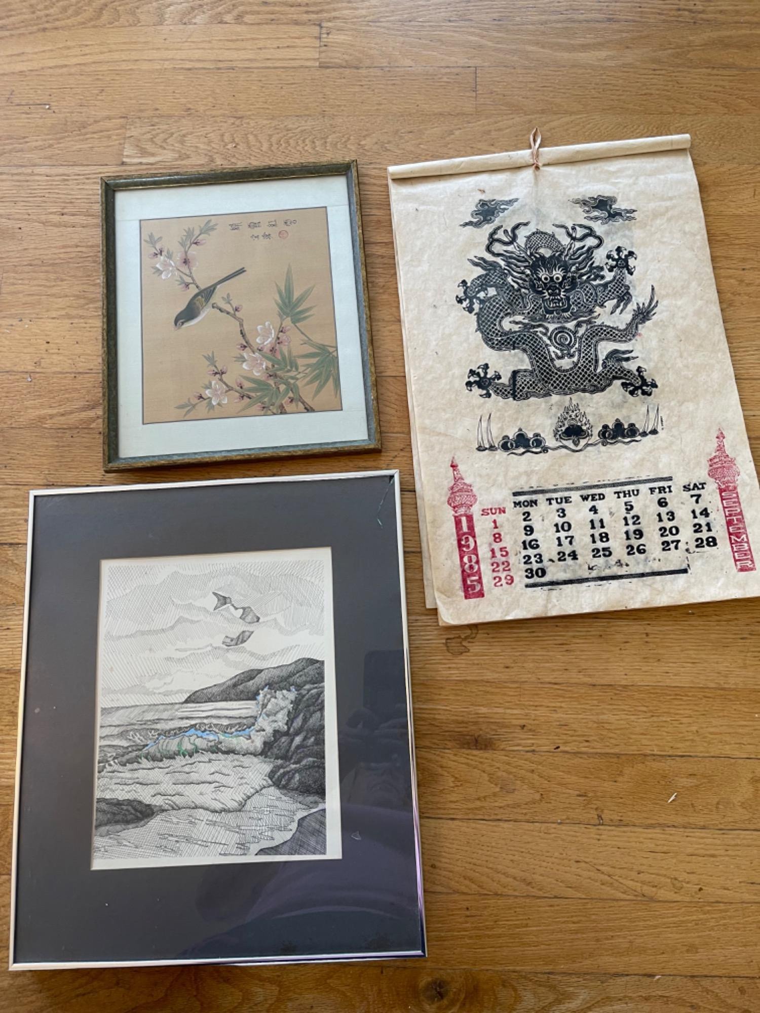 ART- Vintage Asian Calender (Dragon Motif, Year 1985) Jane Kiskaddon Print 1973 (crack in glass) and Bird Print (bought at Yang's Imports 1973) Calendar Measures- 12.75 x 17.75