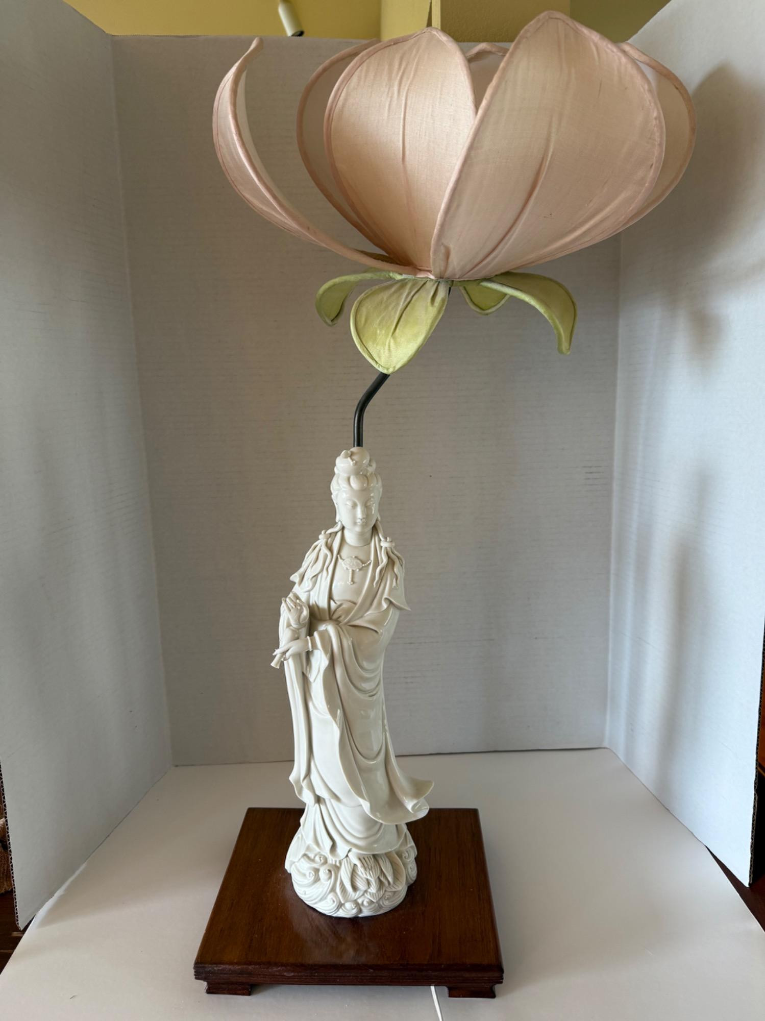 Blanc de Chine Porcelain Lotus Lamp. Wood base, Porcelain figurine and silk shade.