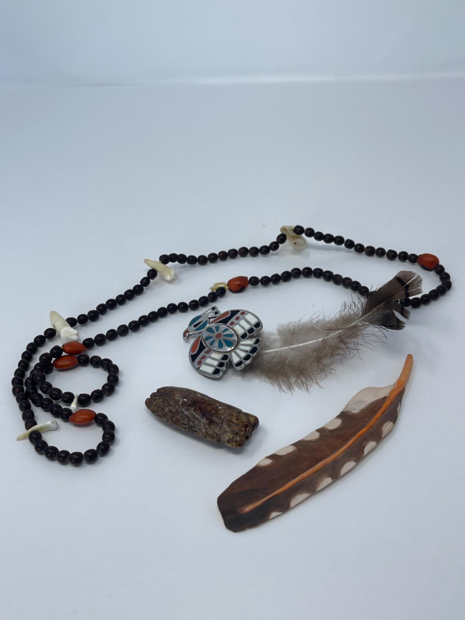 Lot # 186 - Signed Carved Wood Feather, Stone Carved Cricket, Beaded Necklace