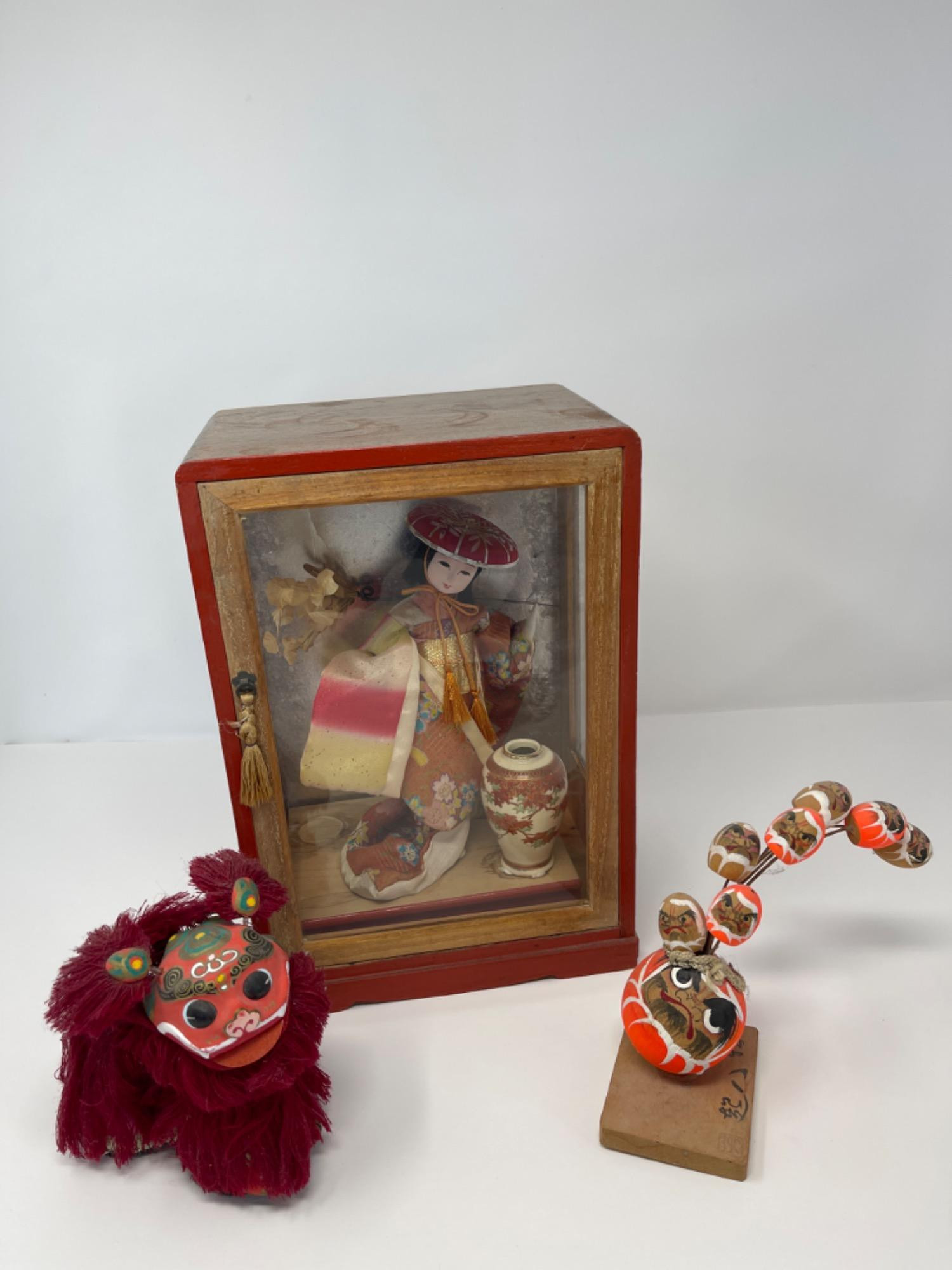 Lot # 200 - Japanese Kokeshi, Chinese Lion and Japanese Geisha in Glass Case