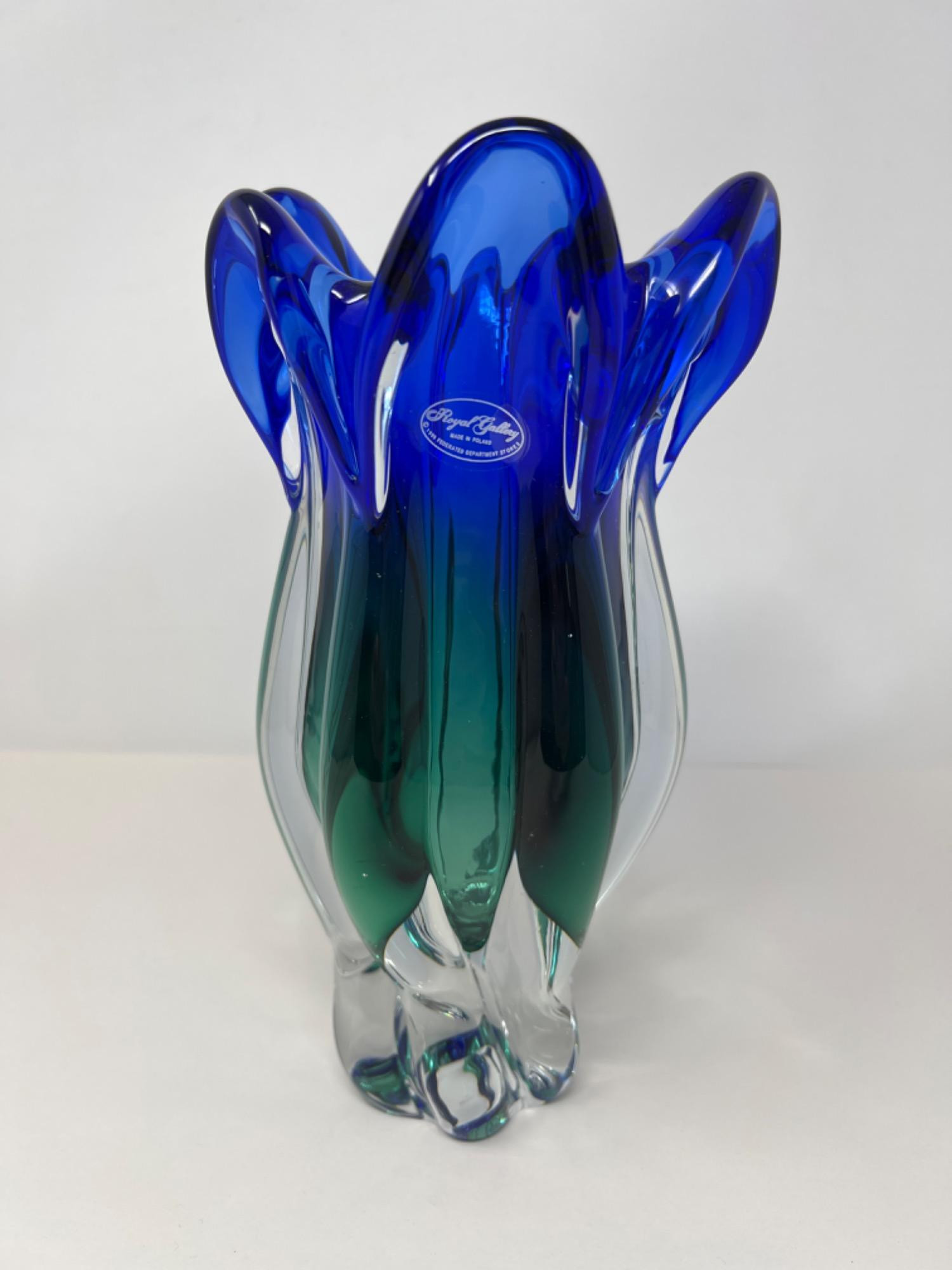 Blue green ombre hand blown glass vase from Poland. Distributed by Royal Gallery. This item has no chips or cracks.