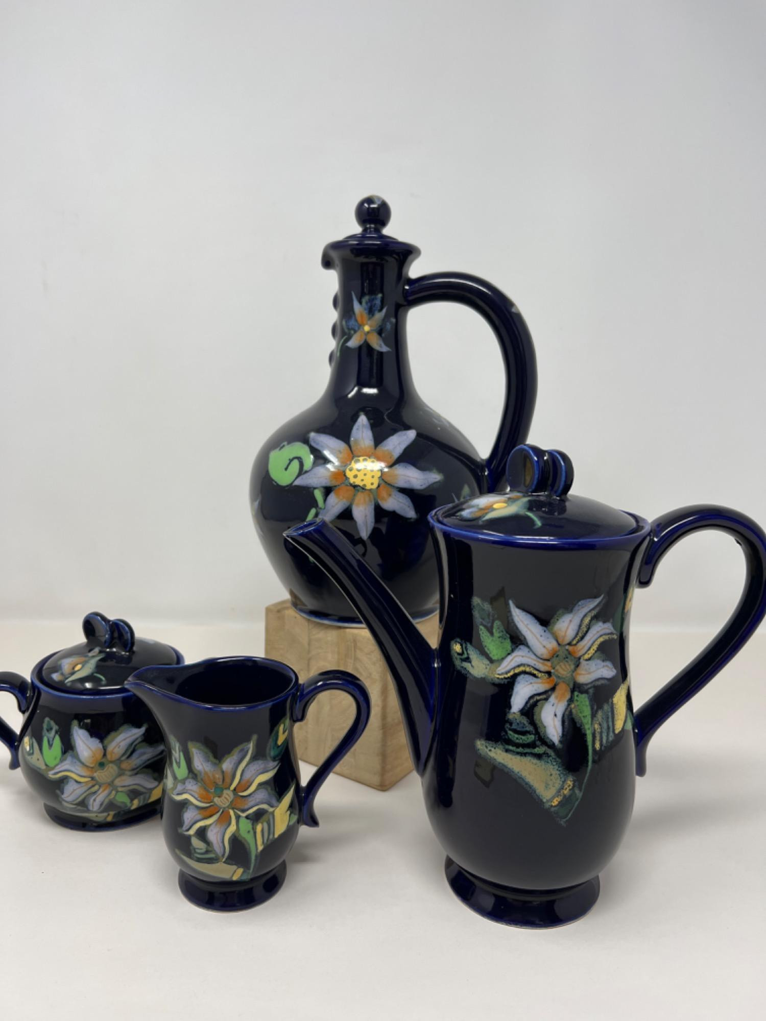 Genuine vintage Finest China brand ceramic/porcelain hostess set with Tea/Coffee Pot, Saki Pourer, and creamer and sugar bowls. Carefully handpainted floral design on cobalt blue background and glazed. Note the unique handles on the lids as they are shaped to the fingers for secure removal of the lid from the pot. This is a rare set that would be a unique addition to any collection as it is nearly antique. The teapot has a 1/2" chip in the porcelain overlay at the bottom (see picture). Saki jug - 8" tall Tea/coffee Pot - 9.5" tall Sugar/creamer - 4.5" tall
