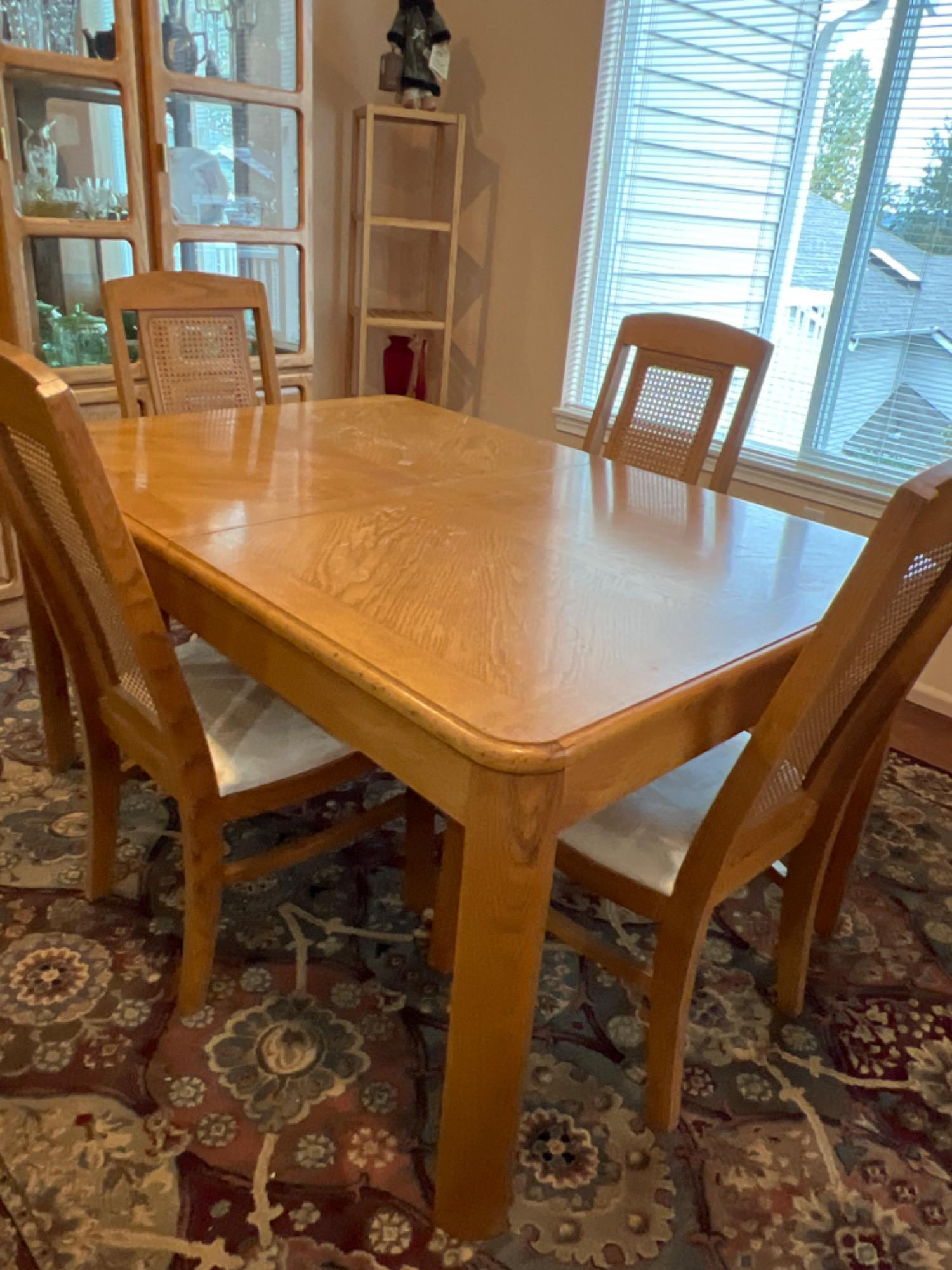 Vintage oak dining table with one 17" wide leaf to extend length of table. There are six (6) cane back chairs aging this set to the mid-century (1960's?). Chairs have cushioned seats and are covered with the original creamy white fabric. The owner was in the process of recovering the chairs with a rust colored upholstery fabric. One chair has been recovered and excess fabric is available. Bidding on this lot is an agreement that: (1.) You will have 2 capable, able-bodied persons to lift and load at a minimum. (2.) You