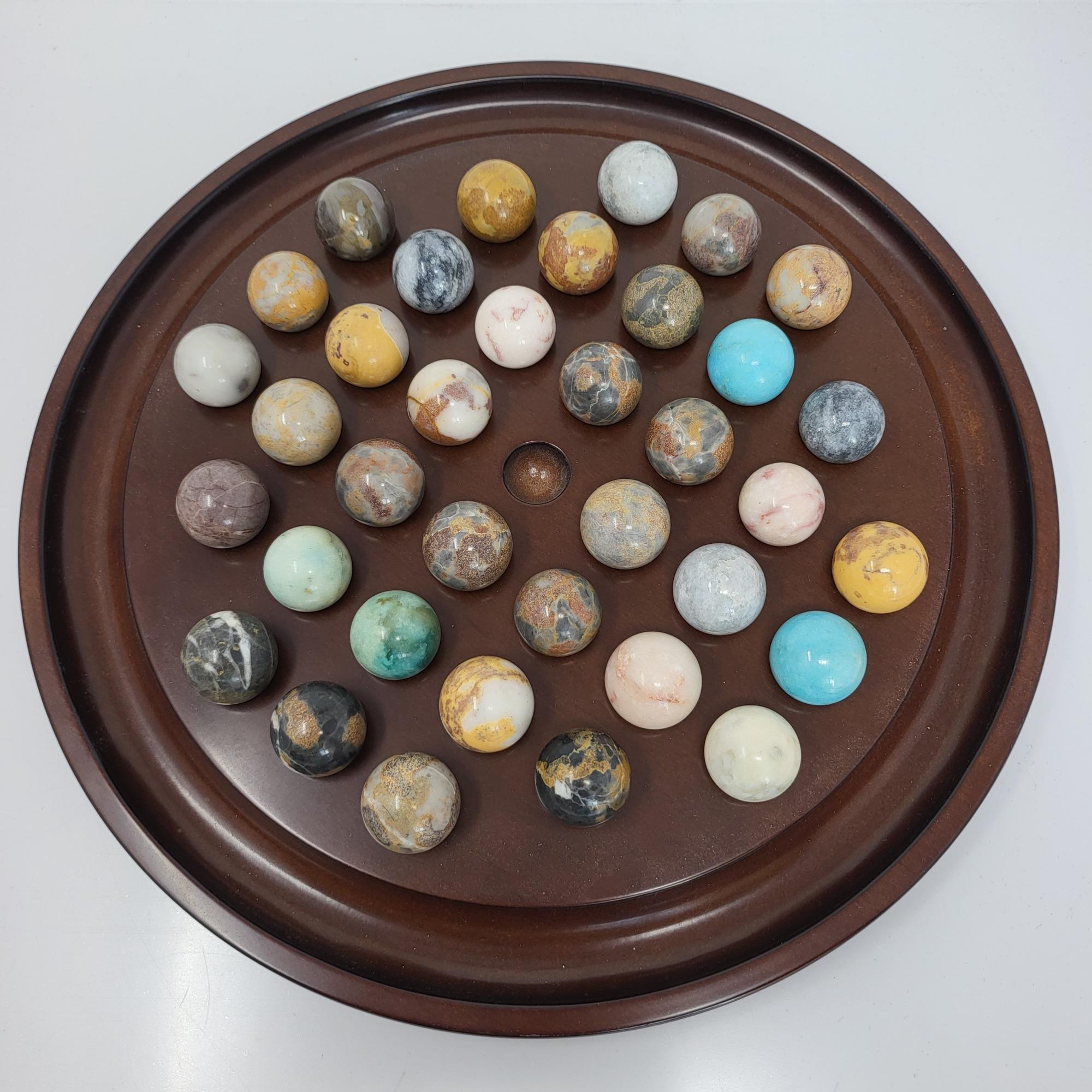 Wood base 13.5", 36 stone marbles that are 1" round. This one-person solitaire game ranges in value from $250 - $500.