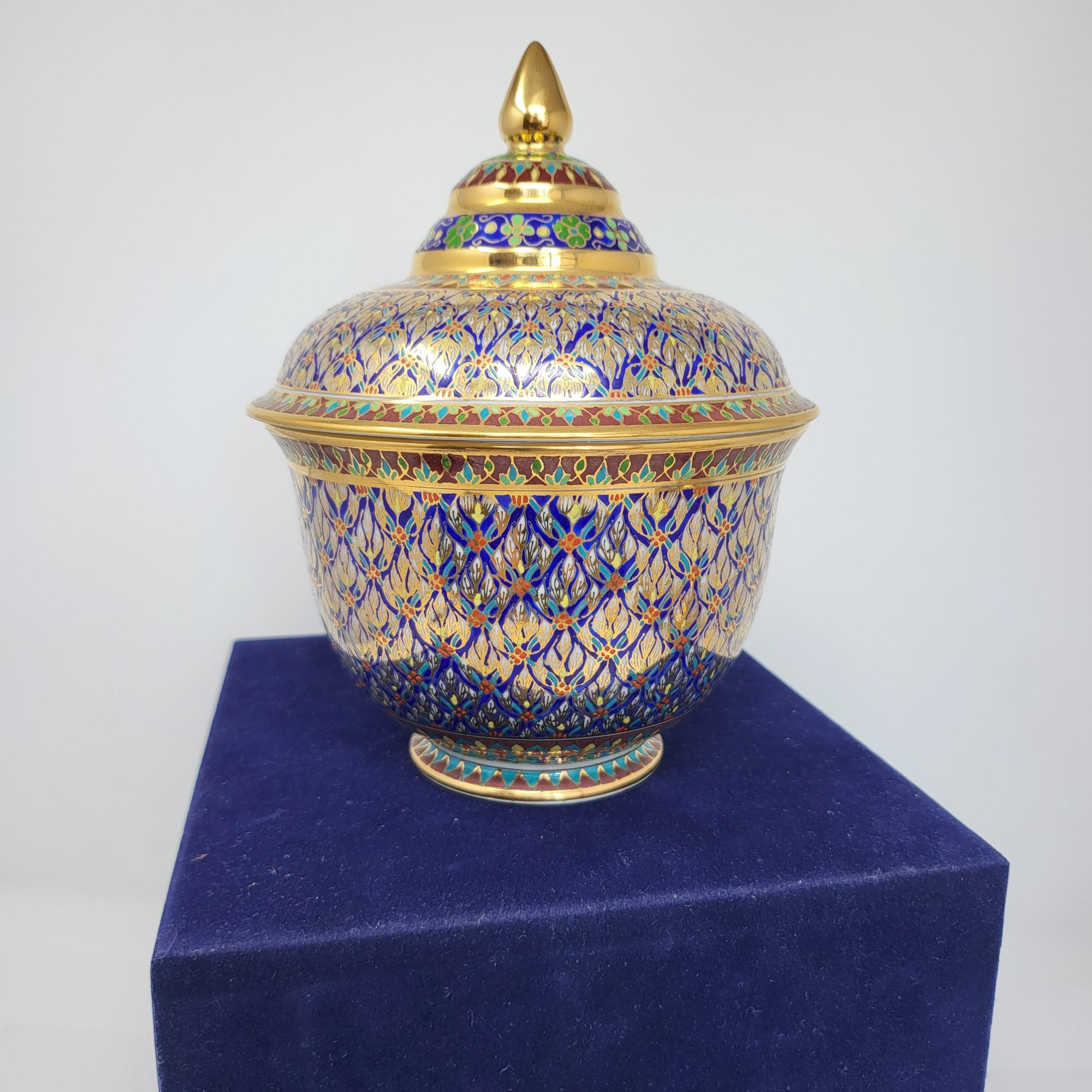 Thailand, Benjarong, 7.5" tall, unsigned, hand painted and gold gilt porcelain lidded urn or jar. Stored in a felt & silk protective presentation box. Acquired in Asia and personally brought to United States.