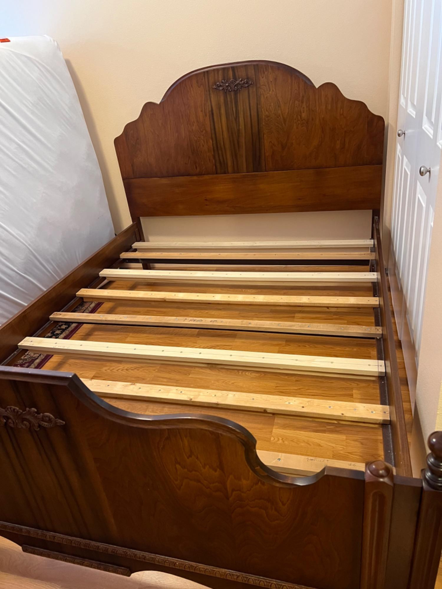 This unique solid wood antique bedframe has been professionally refinished. There are four leg posts at footboard, two at headboard. Wood slats between bedrails have been added to securely hold up a queen size mattress. Legs are drilled at bottom to hold casters (casters included - see pictures). This bed frame is disassembled and owner has labeled the cross bars for easy re-installation. Included is headboard, footboard, slats, casters and two side rails. Smooth finish with inlaid cross grain design and scrolled applique at headboard and footboard. Originally acquired in Canada. See vanity dresser (Lot 11) and four drawer dresser (Lot 90) that match this bed frame to bid on the complete set. Bidding on this lot is an agreement that: (1.) You