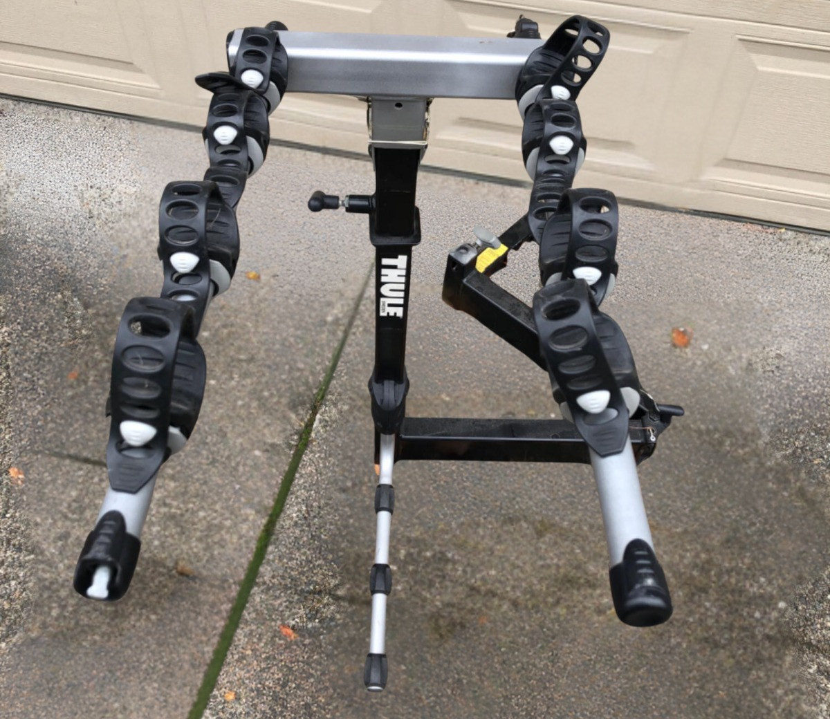 This Thule, Made in Sweden, four bicycle hitch includes all the components to attach the rack and head off on your next four person biking excursion. Sturdy racking system. See representative photo of the Thule system hitched to a vehicle. Locking key system - keys included. Height 3 feet with 22 inch bike arms.