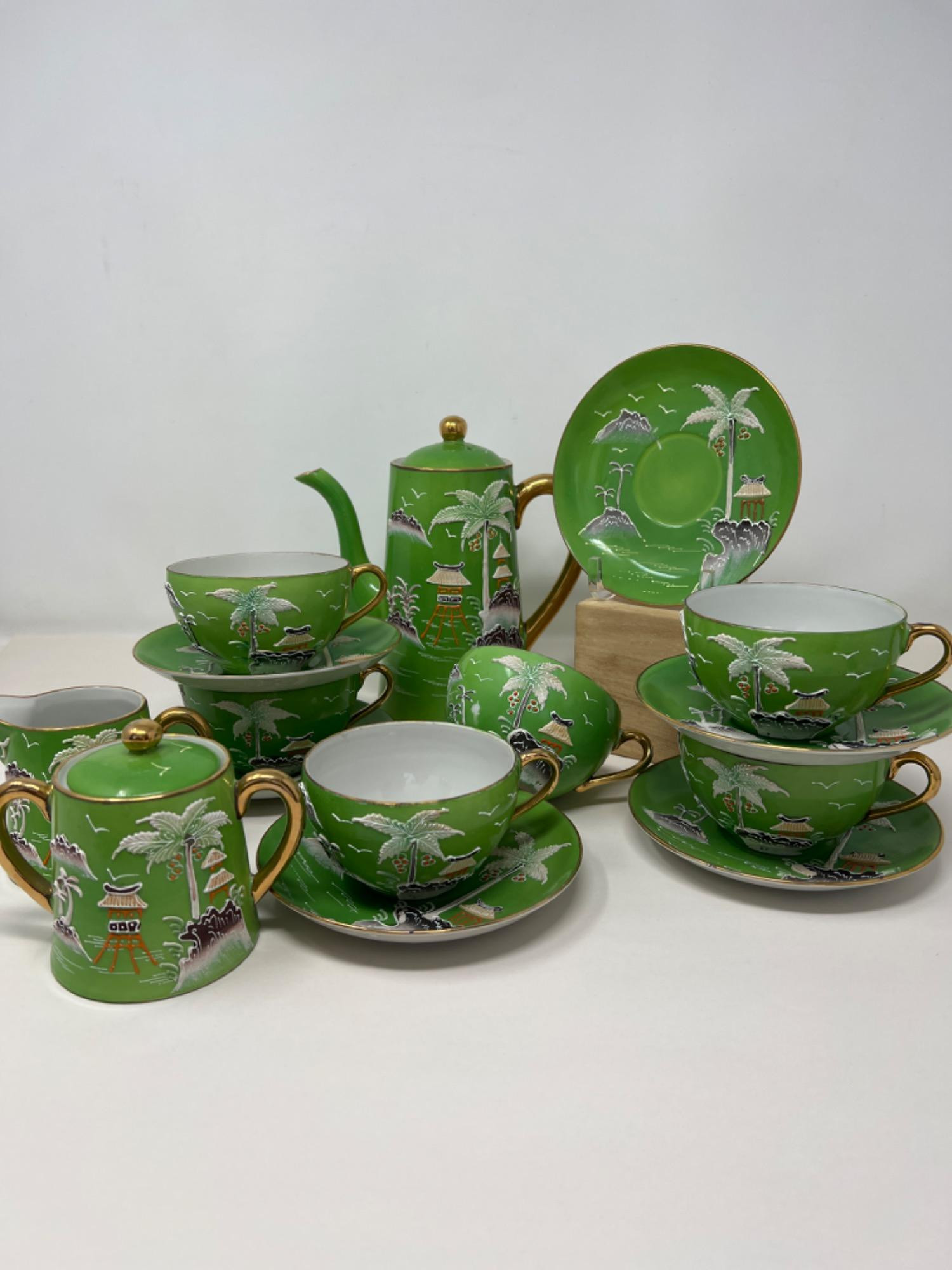Made in Japan. May be TT Satsuma but no marking to confirm. Textured design on green background. Hand painted tea service set. Gold gild edging and handles.