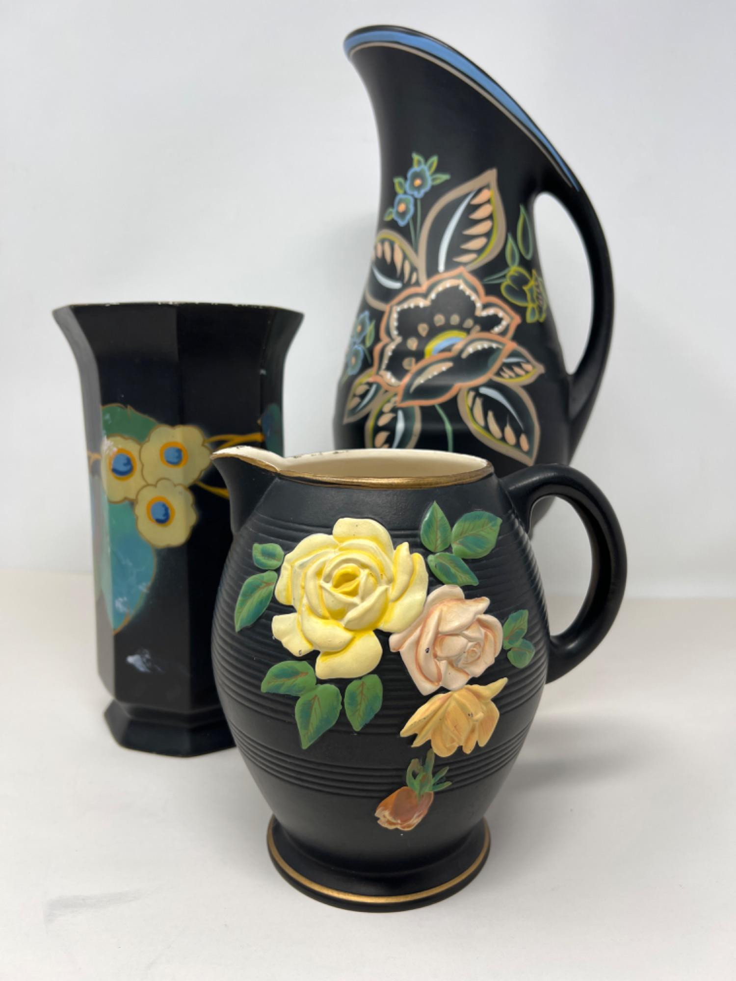 Black painted background and handpainted design work on these antique pottery pieces. Two are Brentleigh and the tall slender vase is Octspill (which is glazed inside vase). Early 20th century and handed down from Grandma Mac and AuntieTessie. Brentleigh 10.5” tall pitcher Brentleigh 6.5” tall pitcher Octspill 8.5” tall vase
