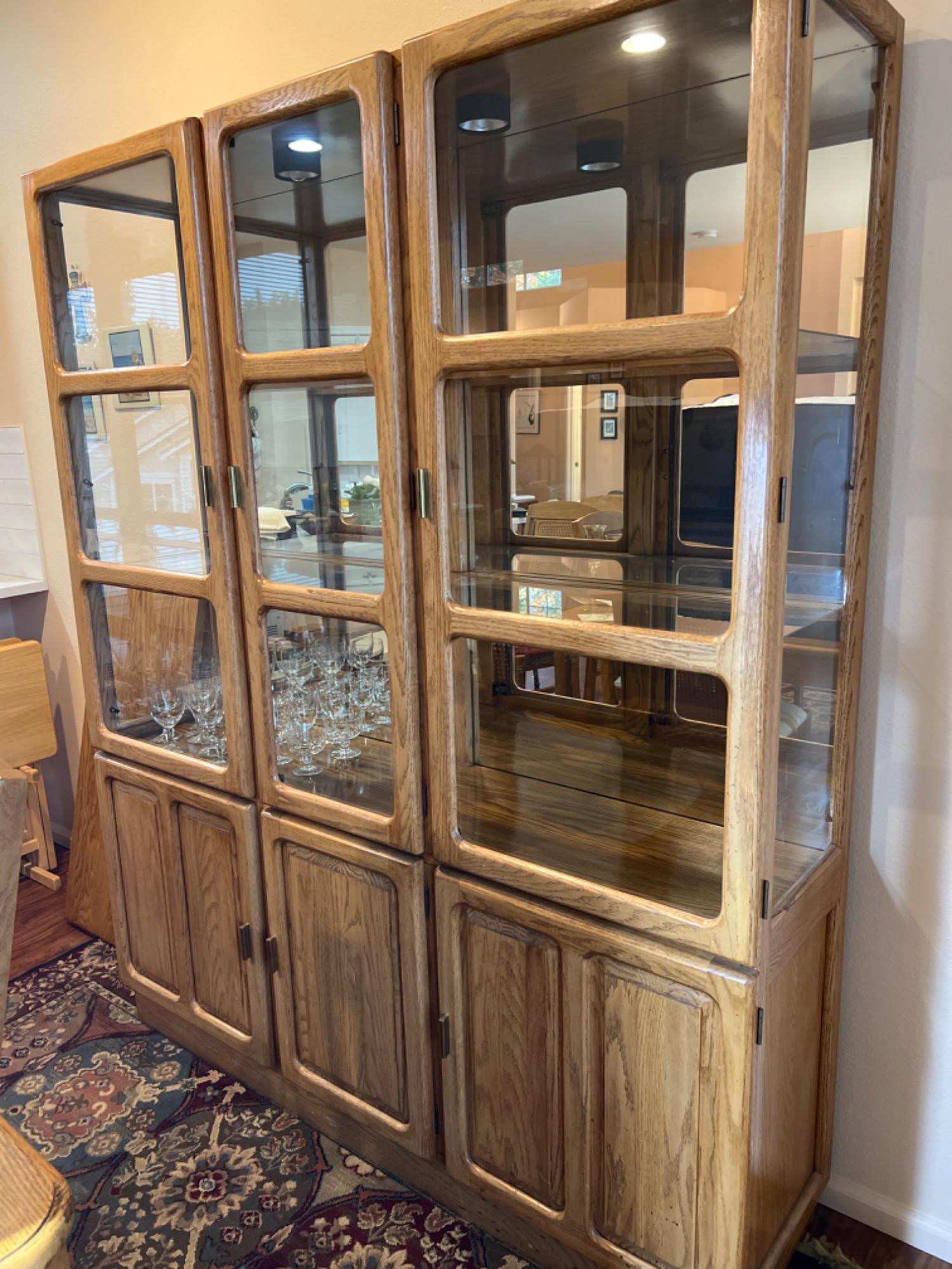 Cabinet has three shelves - wood bottom shelf and two adjustable glass shelves. Glass doors. There are 3 doors that open - two on each side and one in the middle. Back of cabinet is mirrored. Storage below with one shelf that runs the full length of cabinet. Two interior lights. Cabinet ONLY. Does not include the crystal glasses shown in picture. Bidding on this lot is an agreement that: (1.) You will have 2 capable, able-bodied persons to lift and load at a minimum. (2.) You