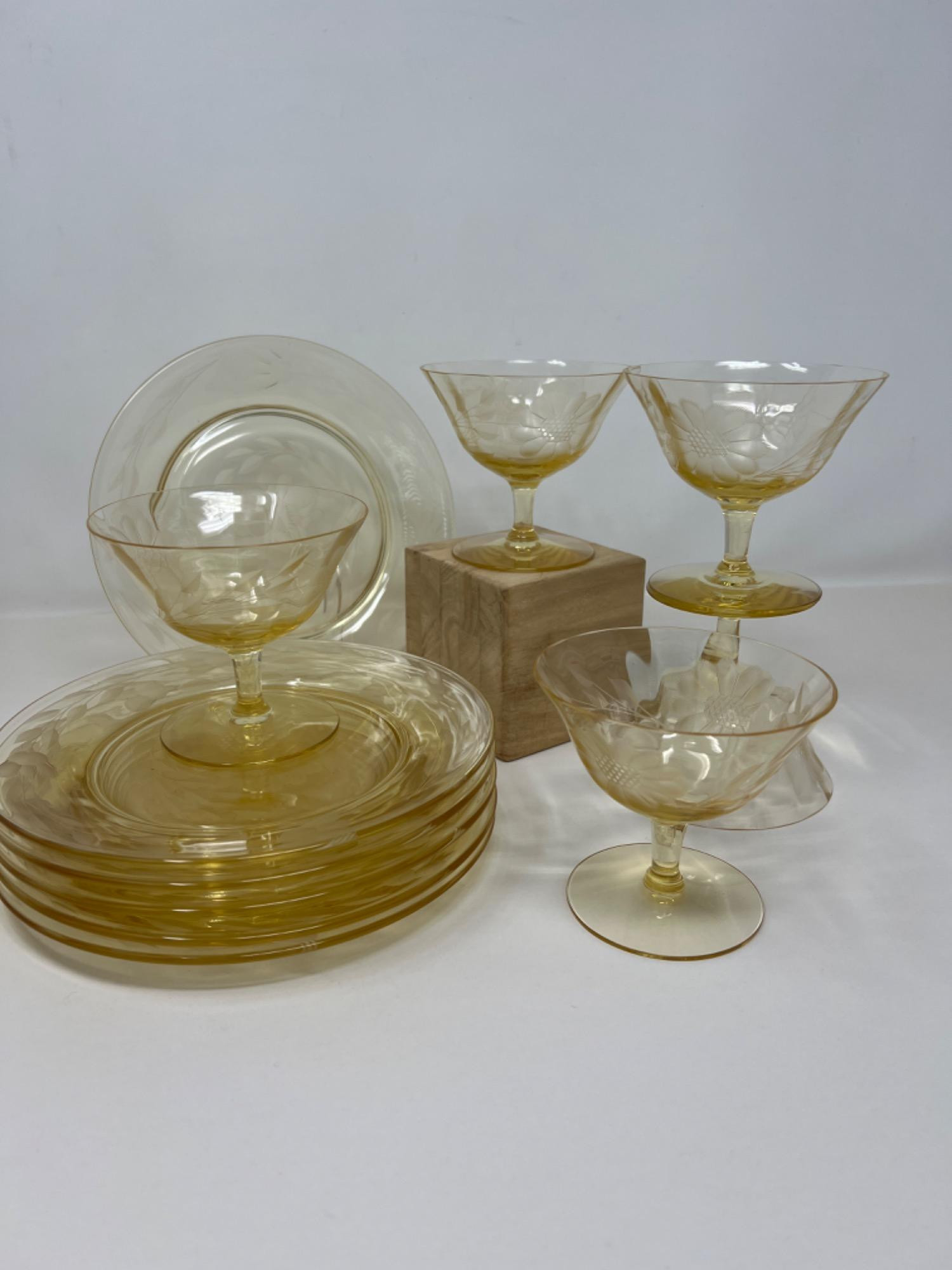 Pedestal yellow depression etched glass parfait 3 inch tall cups. Total of 5 cups. Yellow depression etched glass 7.5 inch round plates. Total of 6 plates.