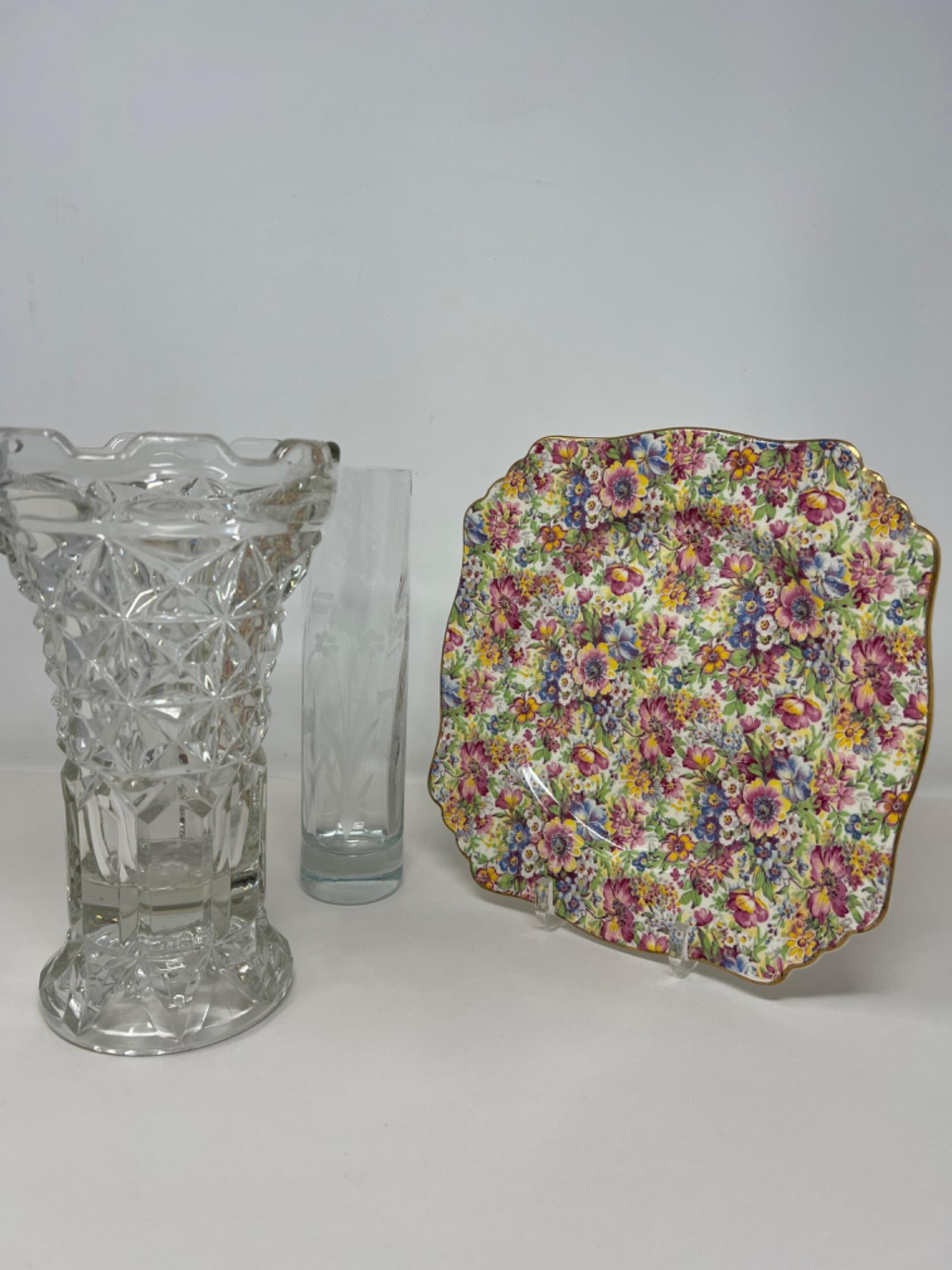 Antique cut crystal vase (12" tall) and etched glass bud vase (11.75" tall). Square Royal Winton Grimwades "Sunshine", made in England, china plate (12").