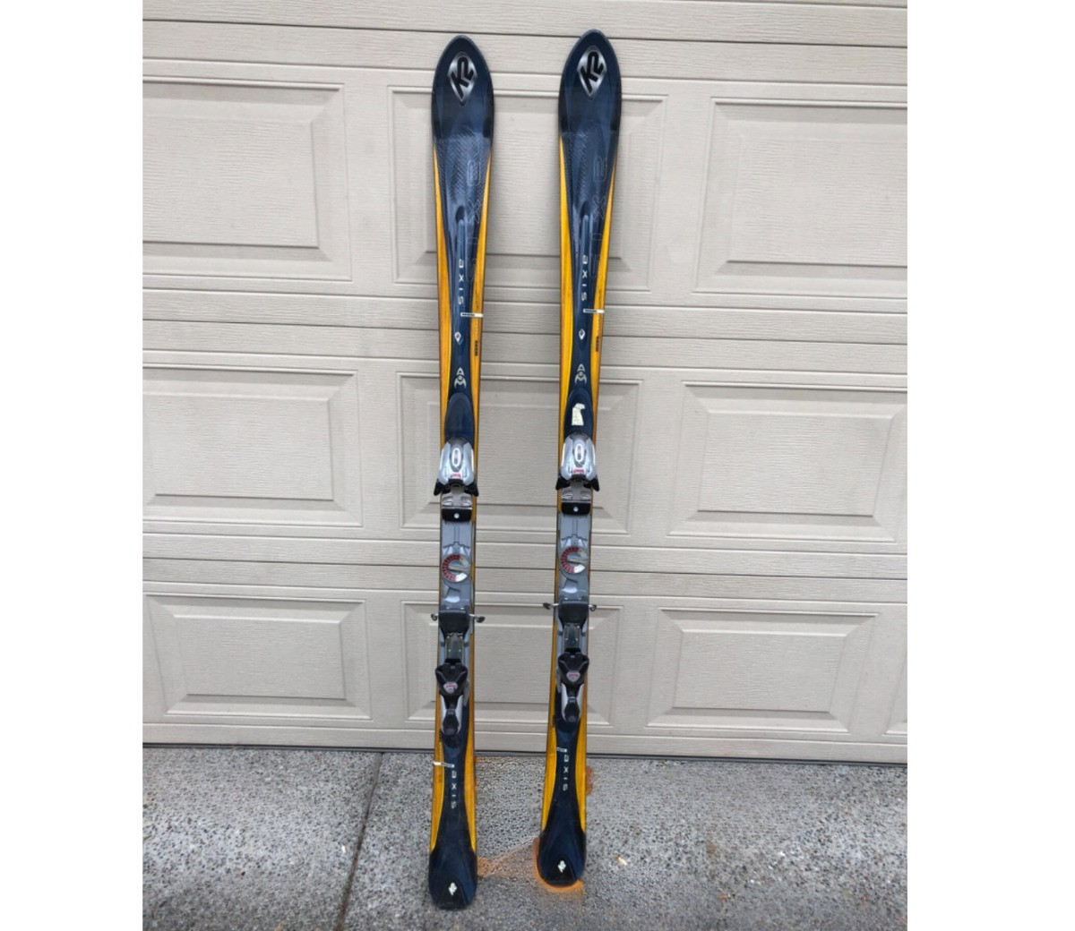 Pair of K2 Axis Skis with 18mm sidecut and titanium bindings. 167 cm length.