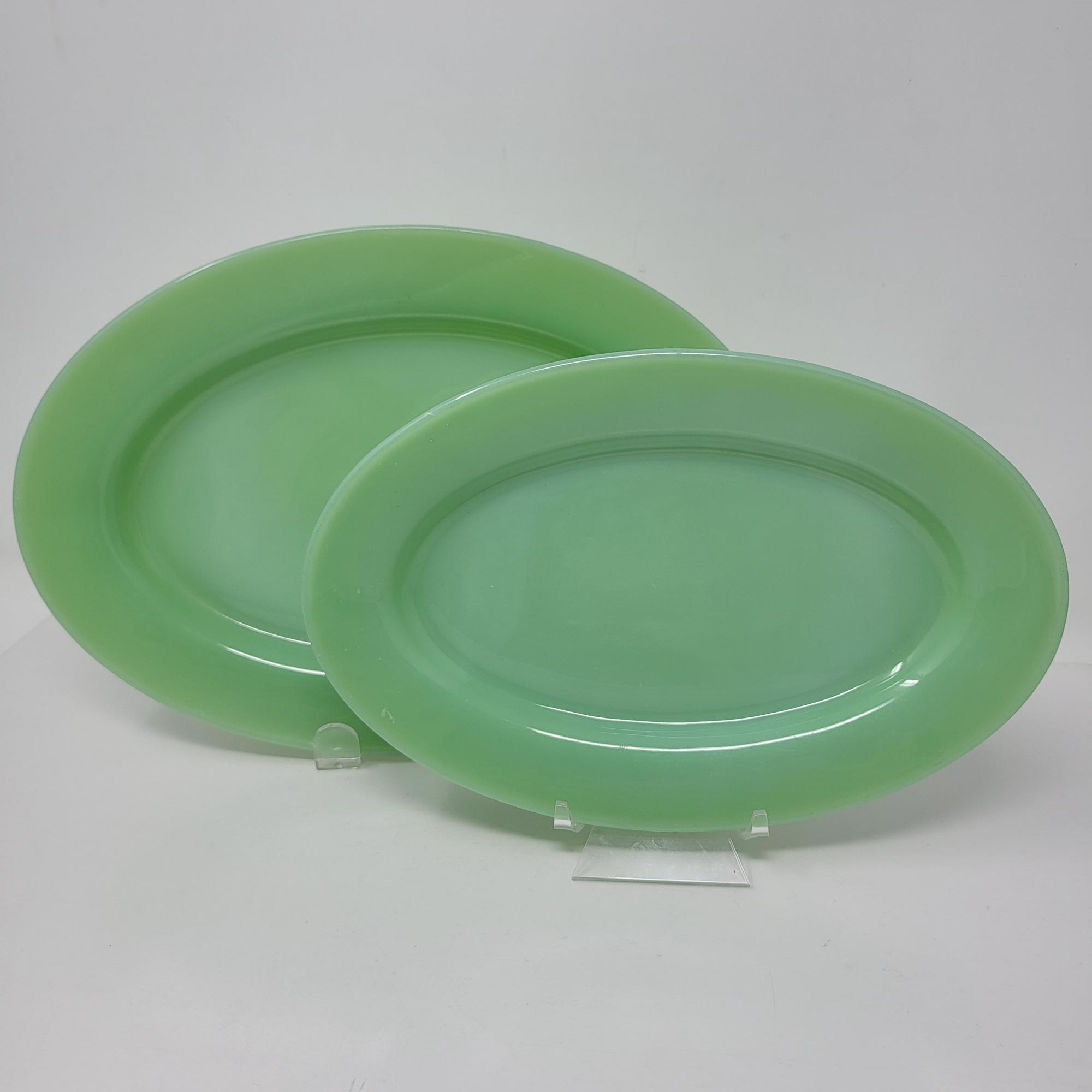 Vintage Fire King, oven ware Jadeite 11.5" x 8" oval platter and 9.5" x 6.25 oval platter. Anchor Hocking 1940's.