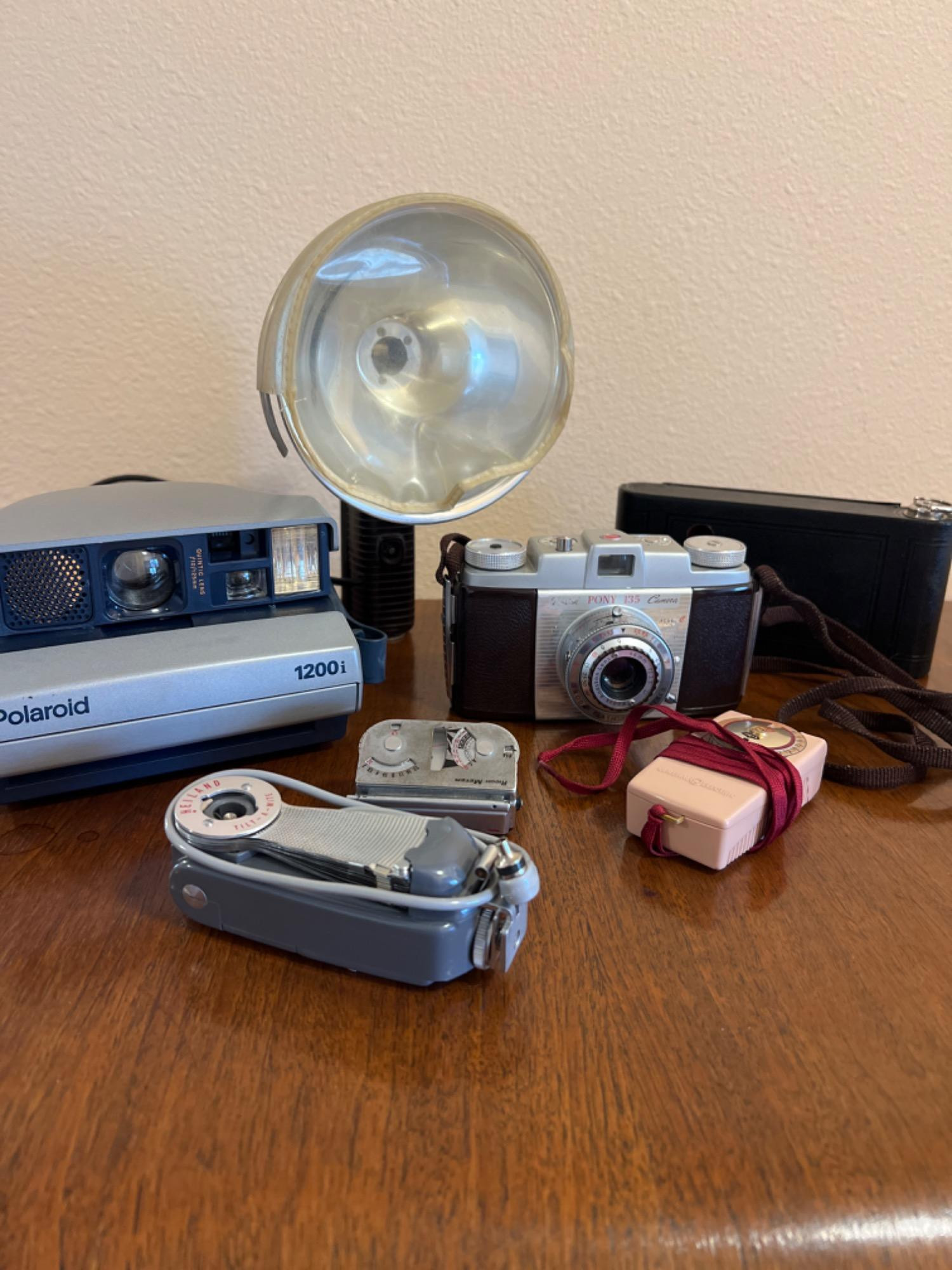 Polaroid 1200si camera and case with instruction book, Kodak Pony 135 camera and instruction book, Kodak flash, light meters, and other accessories. Untested.