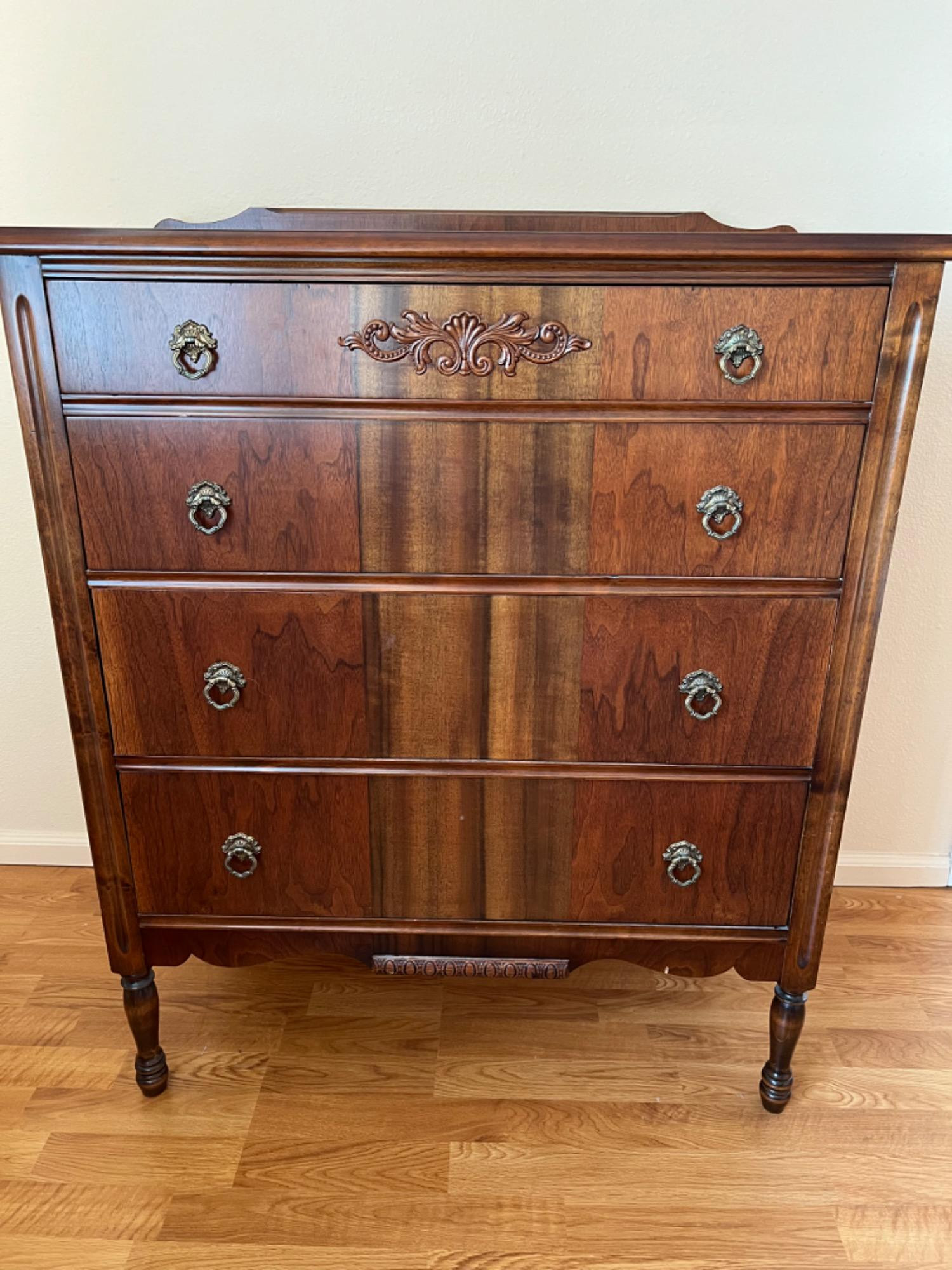 Beautiful and unique four drawer antique dresser that has been professionally refinished. Smooth, satiny surface. Dresser has original drawer pulls. Although not pictured, there are casters that can be attached to the legs of the dresser. Original casters included. Note the unique patterning of the cross grain center inlay giving this dresser a hard-to-find, one-of-a-kind appearance. Dresser was acquired in Canada. See vanity dresser (Lot 11) and Queen Bedframe (headboard/footboard) (Lot 41) that match this dresser to acquire the complete set. Located on 2nd floor that involves steps. Bidding on this lot is an agreement that: (1.) You