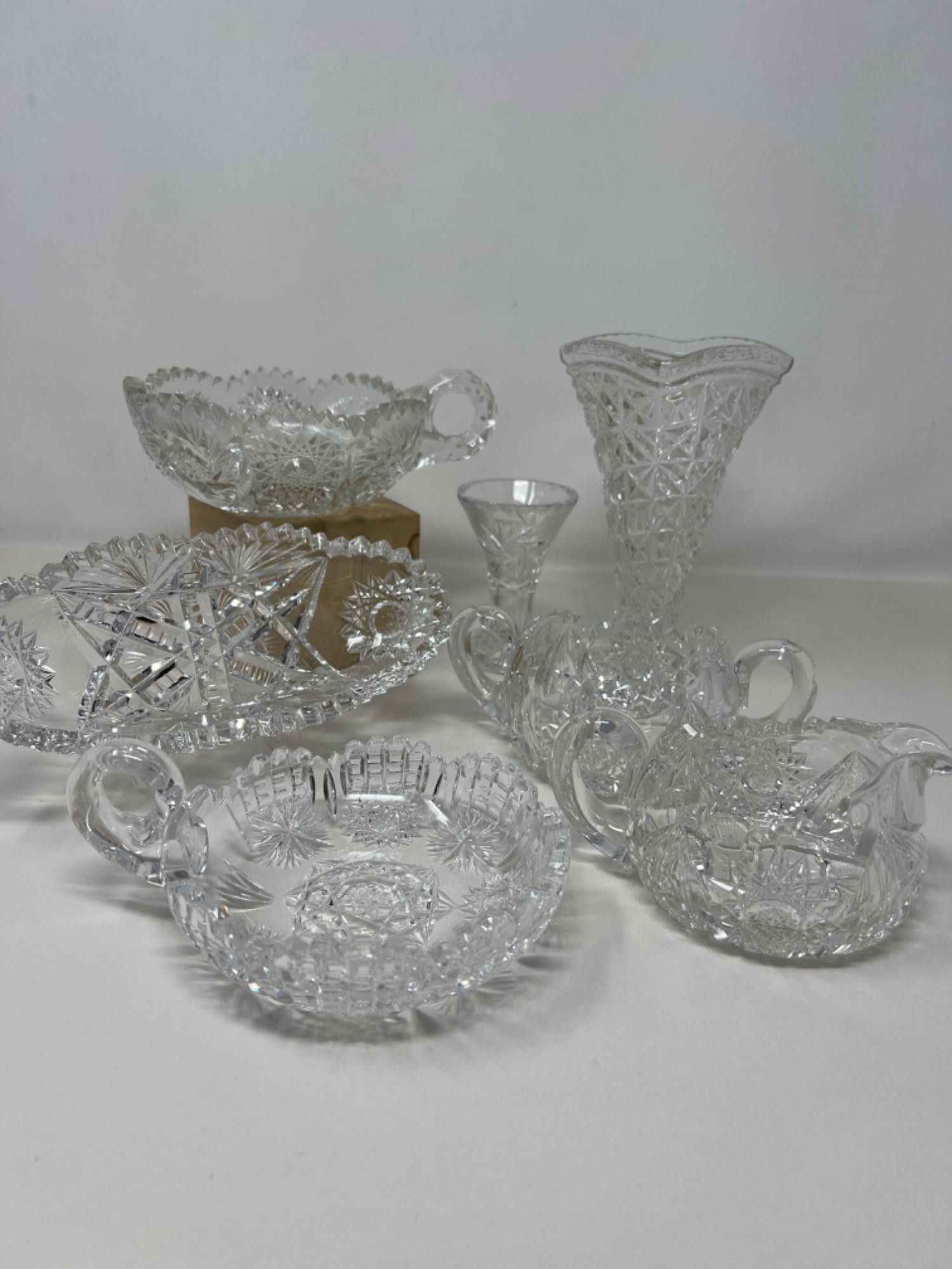A variety of vintage and antique cut crystal table ware that includes an early 20th century vase (Grandma's); and Aunt Elizabeth's gorgeous sugar and creamer & condiment dishes - some with handles. Beautiful pieces without chips or cracks.