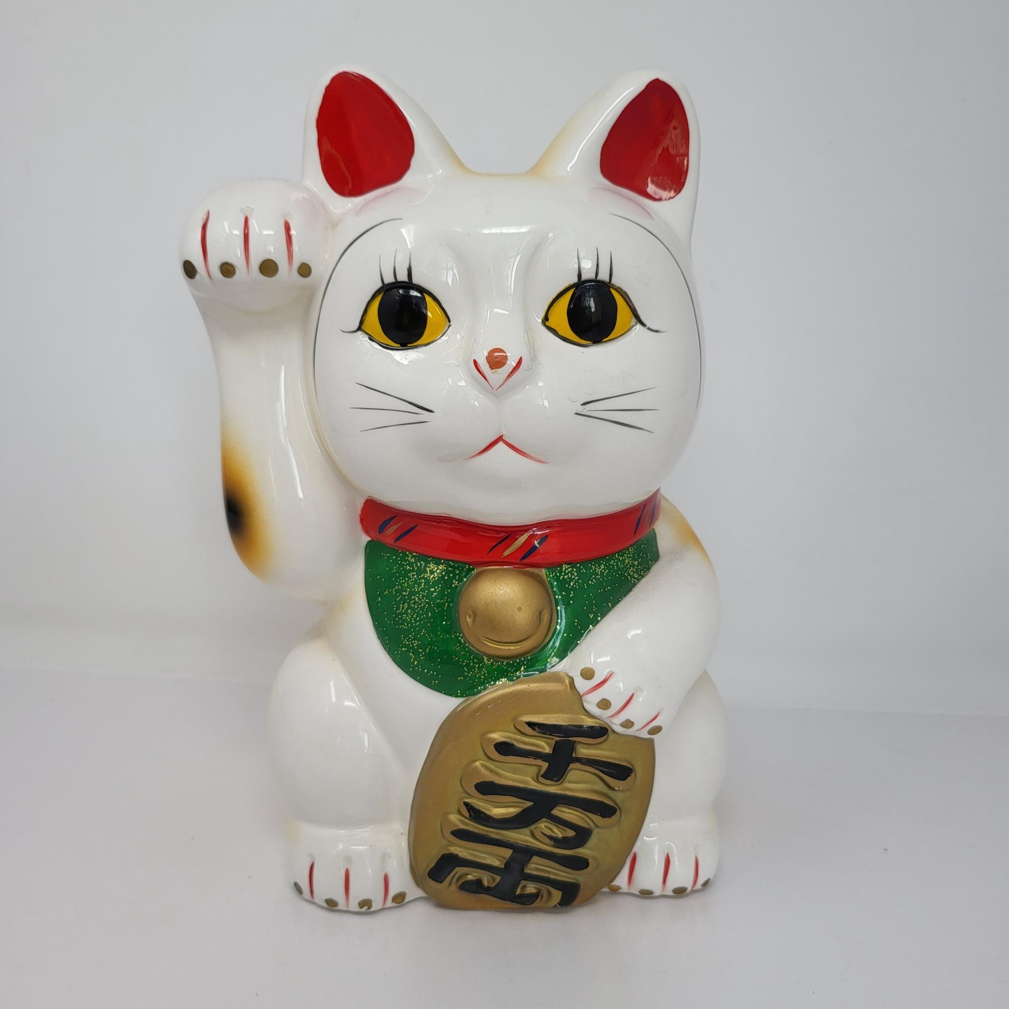 Lucky & Fortune vintage ceramic cat bank, Taiwan. Measures 10" tall. Bottom stopper is intact.