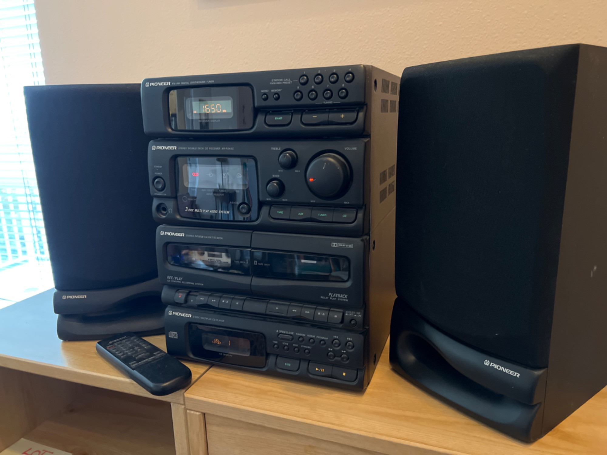 Pioneer XR-P240C multi-play 3-CD player, Dual-Cassette player, AM/FM Radio Component and Left/Right S-P240 Speakers. Remote and Operating Instructions included. Working condition. CD player door needs manual help to open, but it does open and holds up to 3 CDs. 1996. Speaker measurements for one: 12" tall x 10" wide x 11" depth