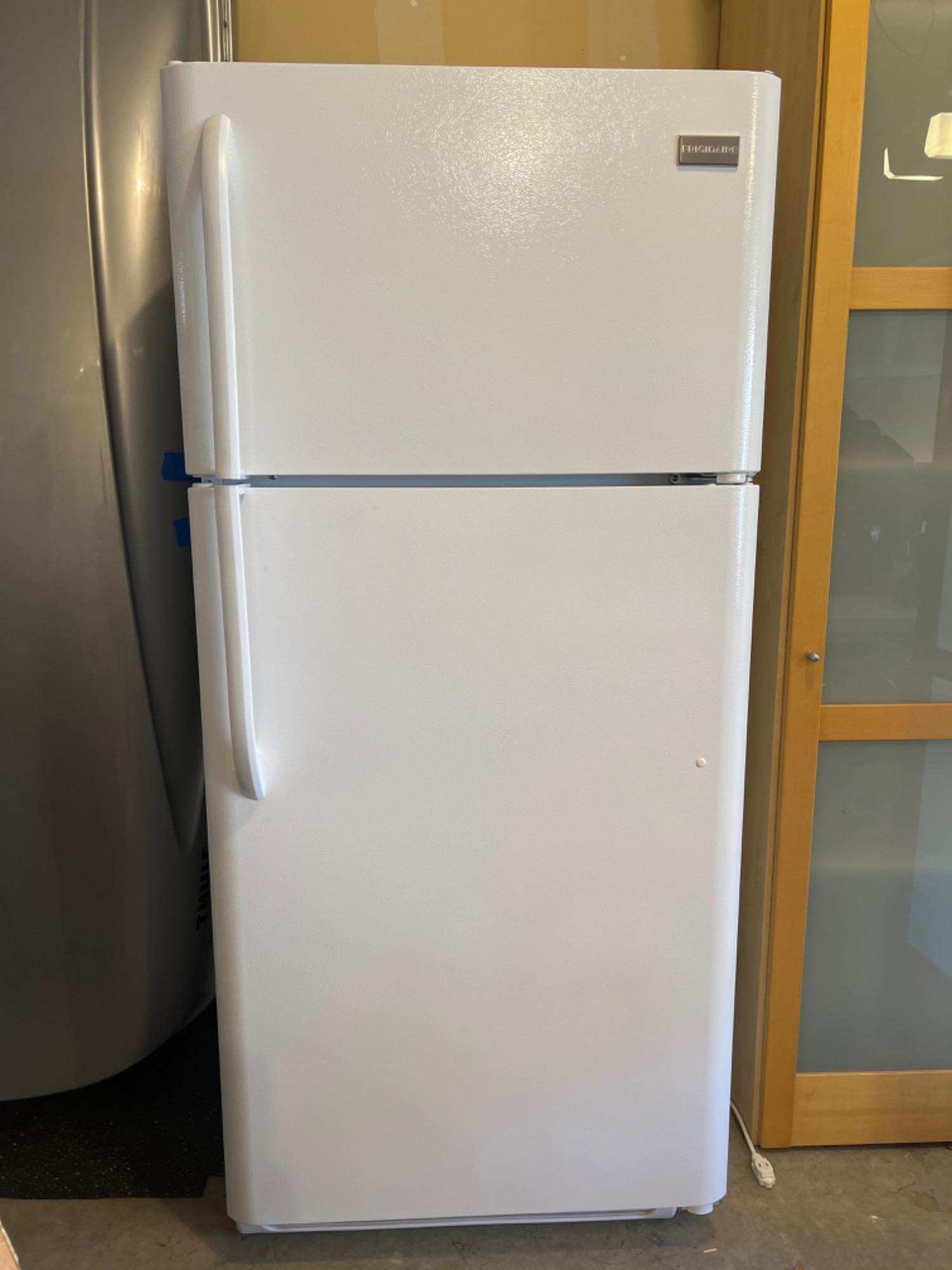 Electrolux Home Products, white Frigidaire combination refrigerator and upper freezer, Model FFTR1814LWJ. Running.