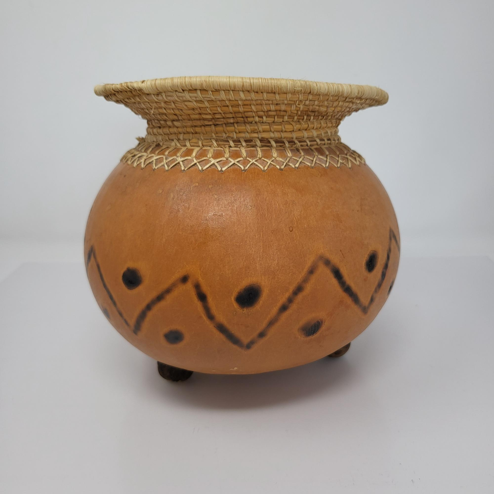 Hand made gourd art pot from Kenya. Features a hand woven coiled dried grass top and three bottom feet.