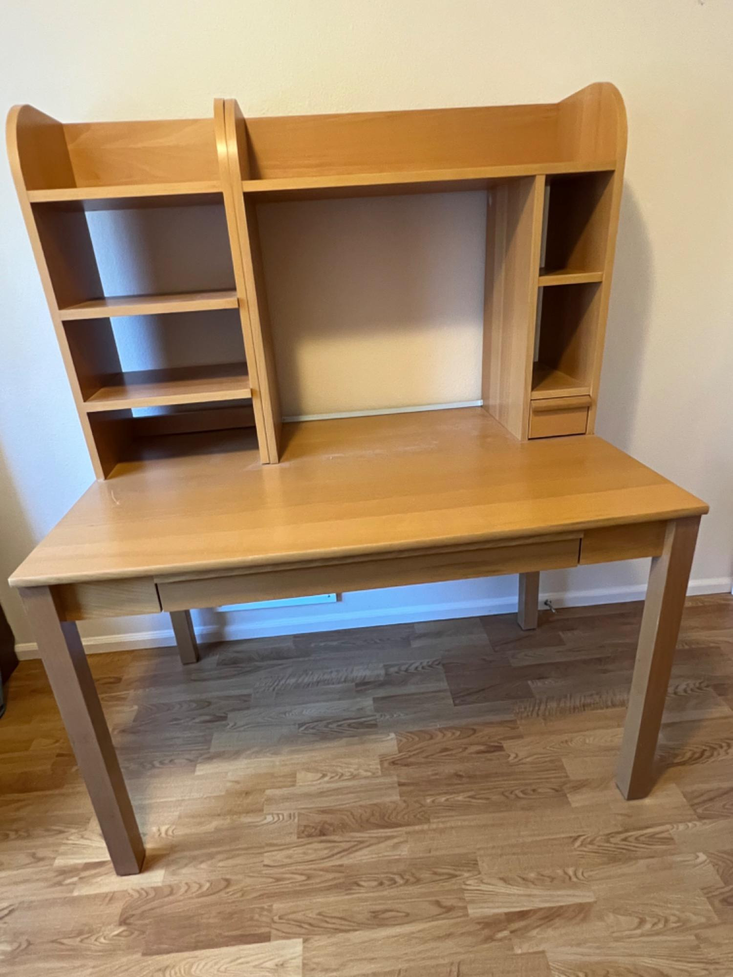 Stylish, modern tabletop desk with center drawer to keep pens, pencils and other office supplies. Can function as art, craft, writing, or computer desk. Two section storage compartments with shelves and drawer to store essentials or hold books and other items. Located on second floor - steps are involved for removal. Bidding on this lot is an agreement that: (1.) You