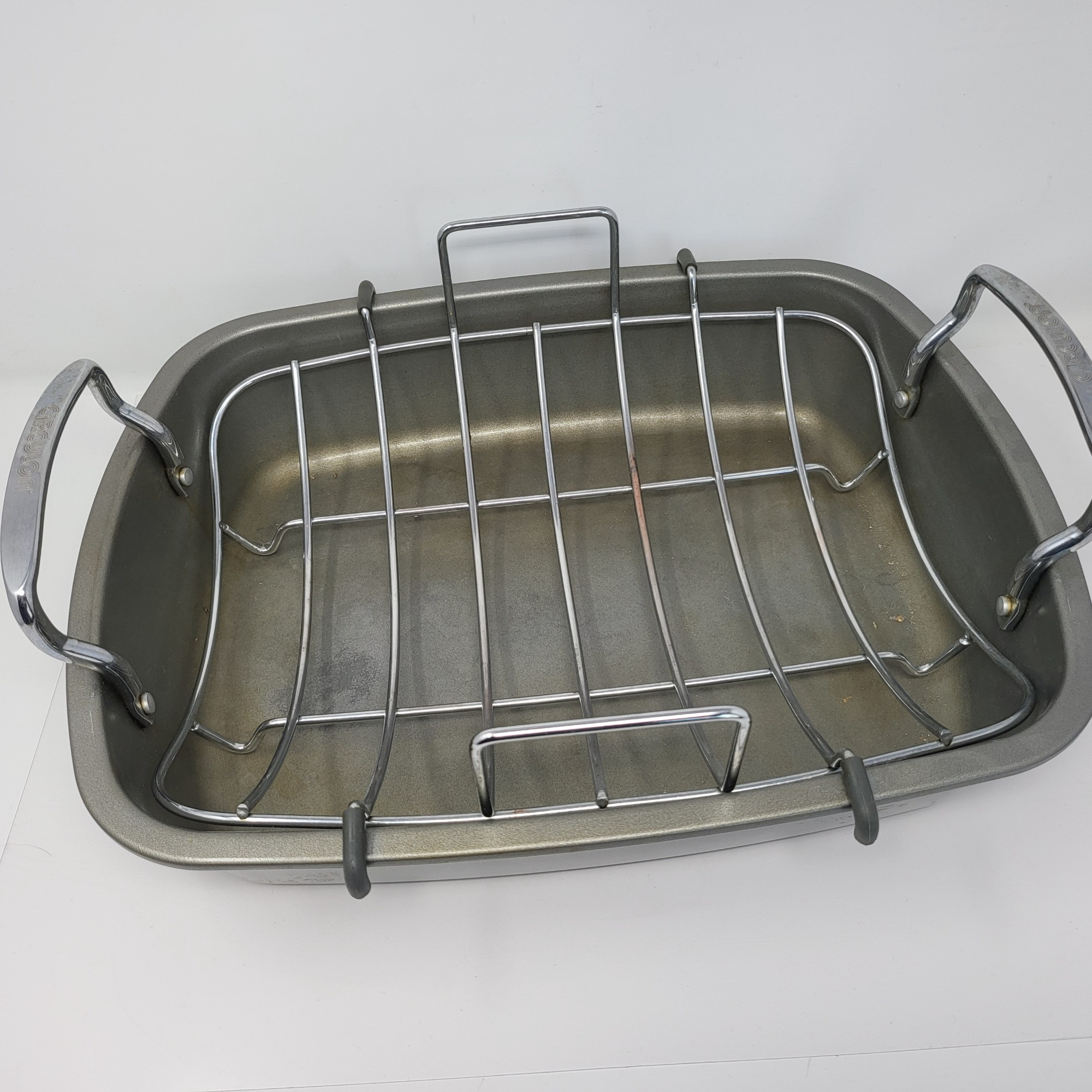 Aluminum Circulon brand double handle 16" x 12.5" roasting pan with curved drip tray insert.