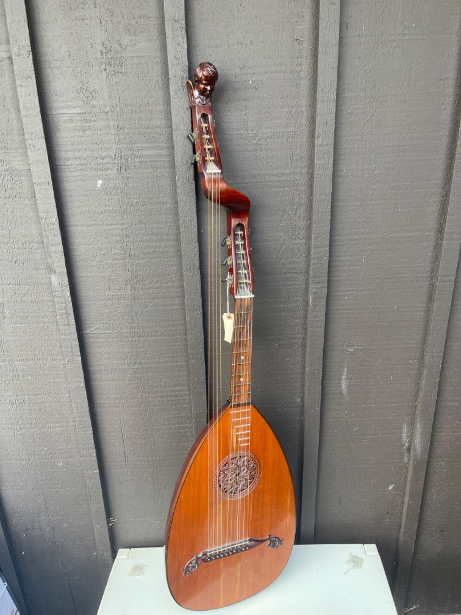 Item: An antique stringed instrument, likely a lute or harp guitar, with a pear-shaped body and ornate carvings. Takeaways: Intricate Craftsmanship: Features detailed carvings and a polished wood finish. Materials: Primarily made of wood with metal strings. Design: Pear-shaped body with a long neck and carved headstock. History: Popular during the Renaissance and Baroque periods in Western Europe, these instruments were valued for their musical and decorative qualities. Body-21.5 x 14 Neck-28