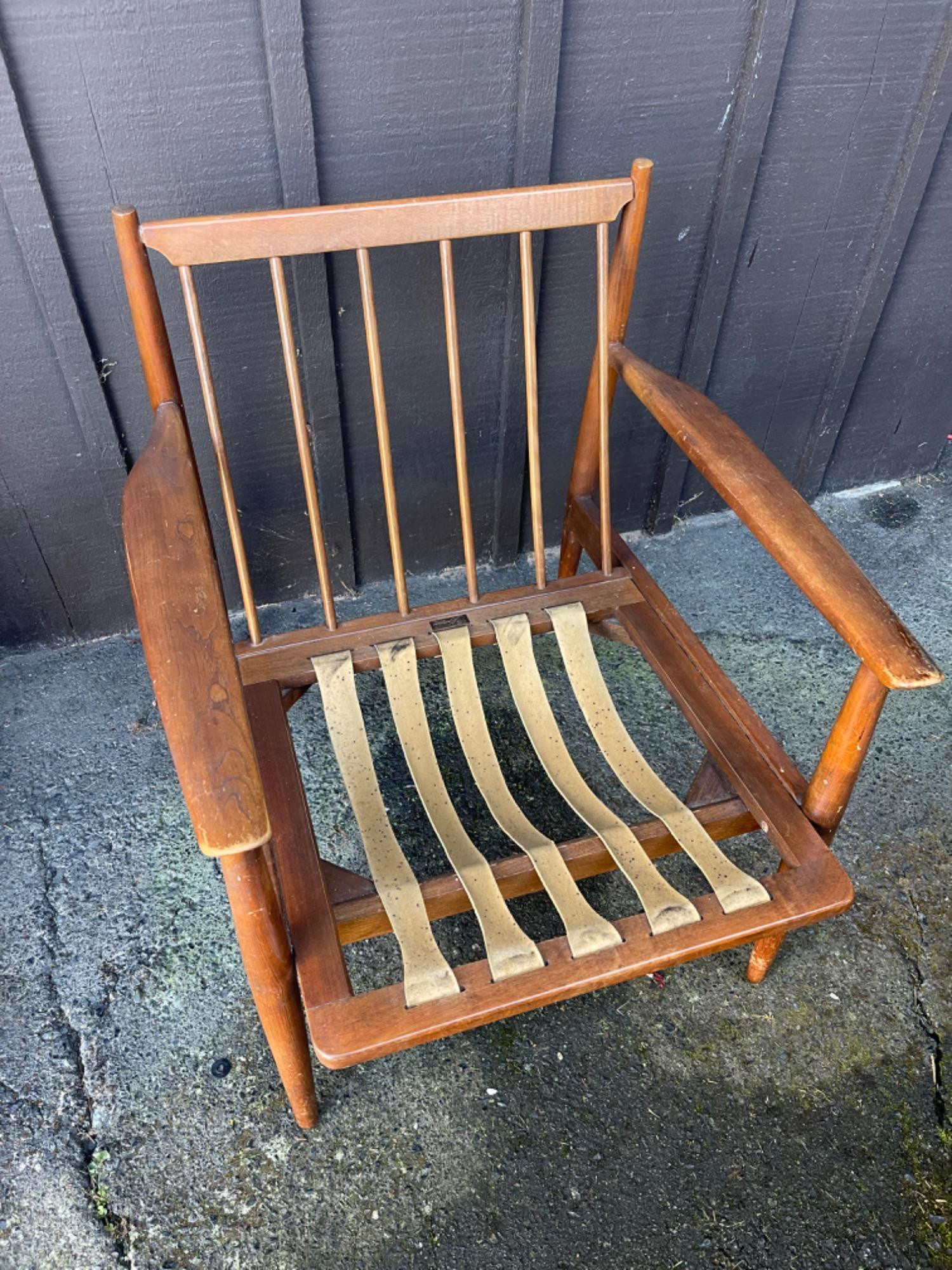 1950s Baumritter New York Lounge Chair #2 Item: A mid-century modern lounge chair from the 1950s, designed by Baumritter. Takeaways: Design: Features a slatted back and seat with armrests. Materials: Made of wood with canvas or similar material straps. Era: Reflects the clean lines and functional form typical of mid-century modern design. History: Baumritter Corporation was known for producing stylish and affordable furniture in the mid-20th century, popular in American homes for its simplicity and functionality. Dimensions- 27 W x 31 D x 29T
