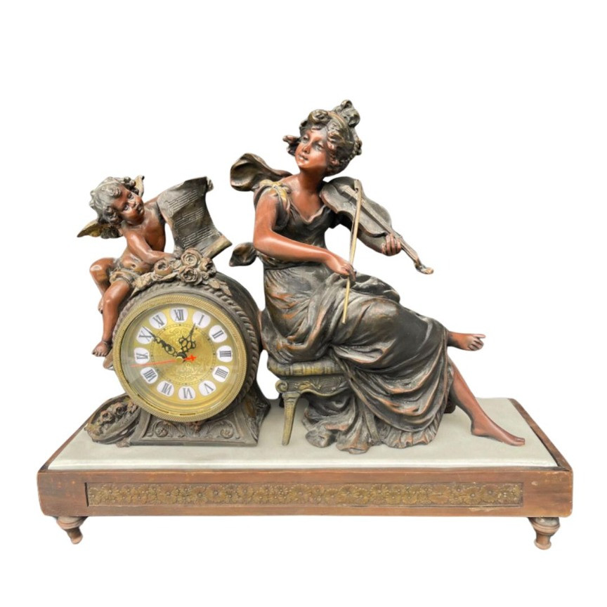 This is a decorative quartz mantel clock featuring classical figurative sculptures. Item: Mantel clock with classical figurative sculptures Dimensions: Approximately 19 inches tall, 17 inches wide Design: Ornate figures, possibly mythological or historical Clock Face: Quartz movement with Roman numerals Clock and Figures: Bronze-like material (exact composition not confirmed) Structural Support: Possibly other metals Inspired by classical antiquity or neoclassical art movements, this clock is designed to evoke elegance and historical significance. Such pieces were often created to add a touch of sophistication to home decor.