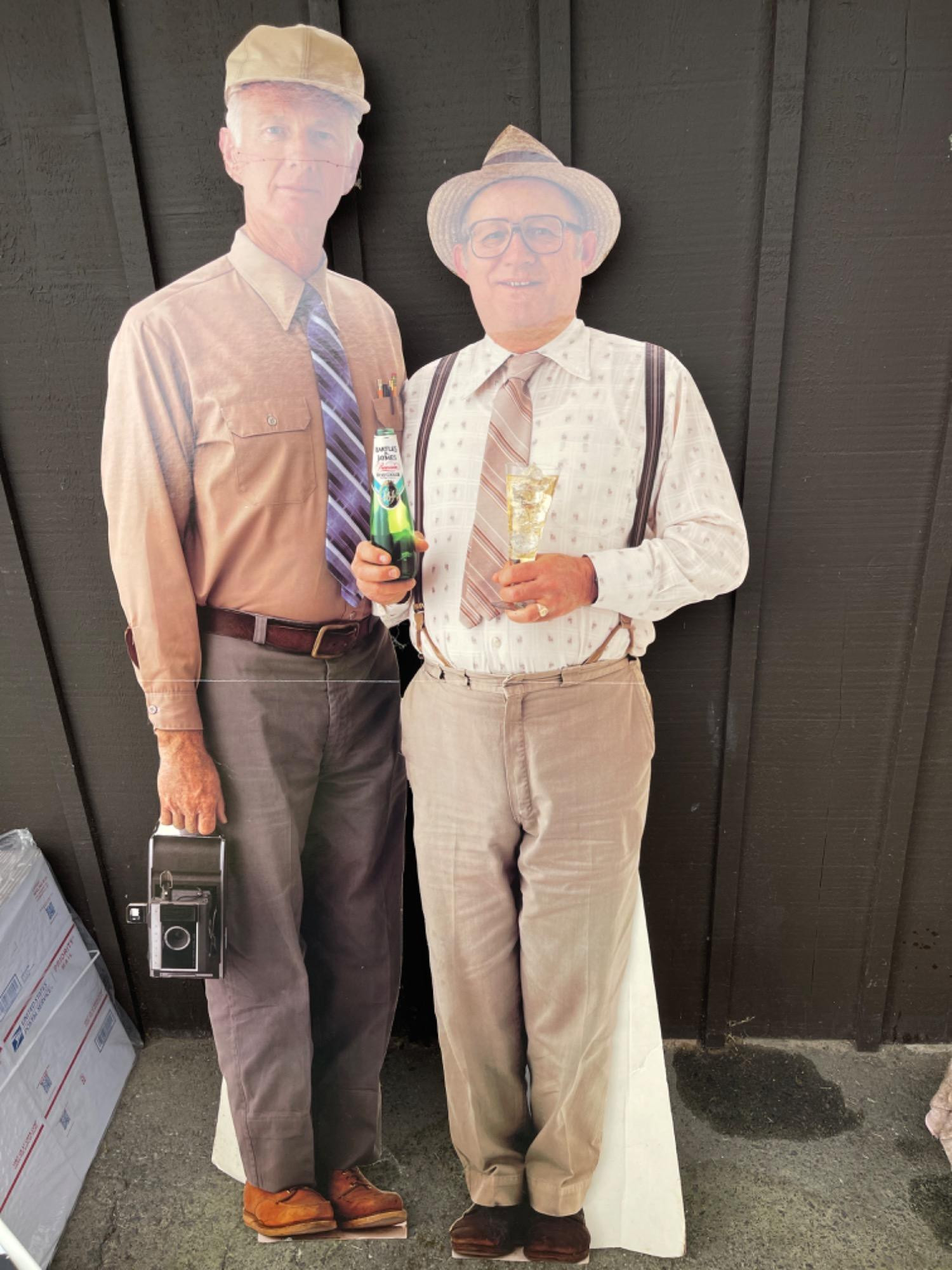 , measuring 73 inches by 35 inches. Item: Promotional cutout, free standing for Bartles & Jaymes, Premium Wine Cooler of California Dimensions: Approximately 73 inches tall, 35 inches wide Purpose: Used for advertising or promotional purposes Vintage, which may add to its collectible value Promotional cardboard cutout like this one were commonly used in advertising products, events, or brands. Their large size and eye-catching designs made them effective marketing tools. This particular cutout, given its vintage status, could be a collectible item for enthusiasts of advertising memorabilia.