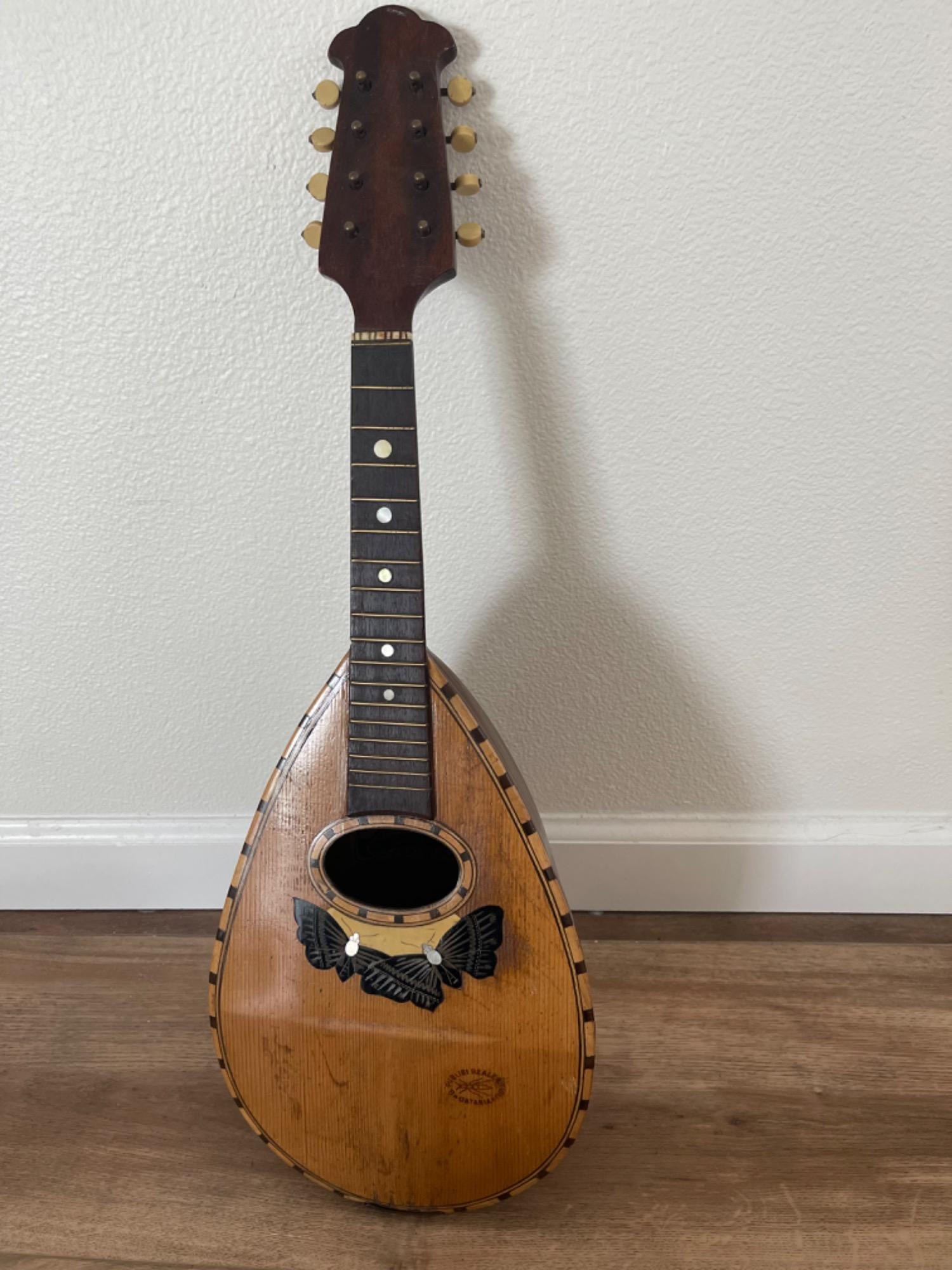 Item: A vintage mandolin crafted by G. Puglisi Reale & Figli, featuring a pear-shaped body and intricate design around the sound hole. Takeaways: Craftsmanship: Made by the renowned Italian luthiers G. Puglisi Reale & Figli. Materials: Various woods, likely including spruce or maple for the body and ebony or rosewood for the fretboard. Design: Pear-shaped body with detailed wood inlay and eight tuning pegs. History: G. Puglisi Reale & Figli were prominent in the early 20th century, known for their high-quality string instruments. Their mandolins are valued for their craftsmanship and historical significance.