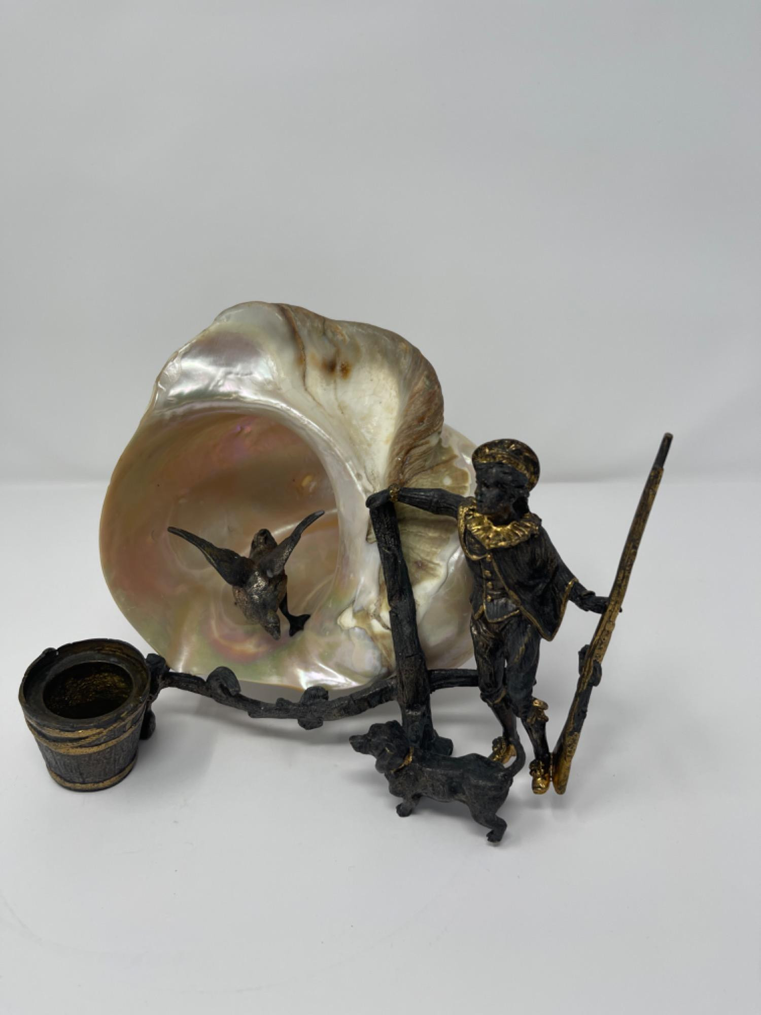 Renaissance-Style Prince, Mallard and Dog Seashell Toothpick Holder 6 T x 8 W This is a decorative toothpick holder featuring a renaissance knight holding a musket, a dog, and a duck, made from a large seashell and metal. Item: Toothpick holder Dimensions: Approximately 6 inches tall, 8 inches wide Holder: Seashell (possibly pearl oyster) Figures: Metal (likely bronze) with gold-colored detailing accents This piece combines natural elements with crafted metal figures, inspired by Renaissance art. Such items were often created for decorative purposes and reflect the artistic trends of combining functionality with ornate design. This unique toothpick holder is both a collectible and a conversation piece.