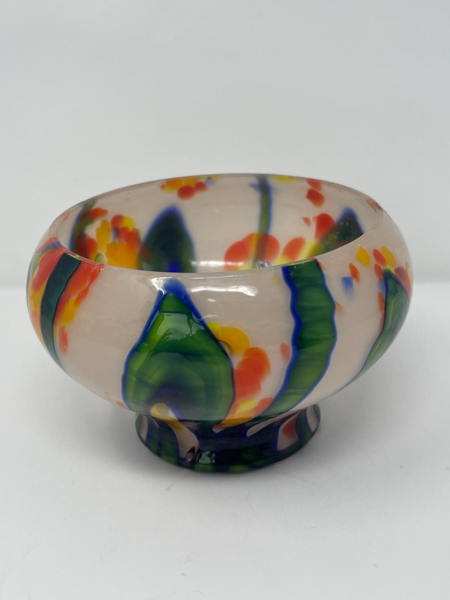 This is a hand-blown glass vase with a vibrant multicolored pattern. Dimensions: Approximately 6 inches tall, 4.5 inches wide Design: Features a unique, multicolored swirl and speckle pattern Maker unknown