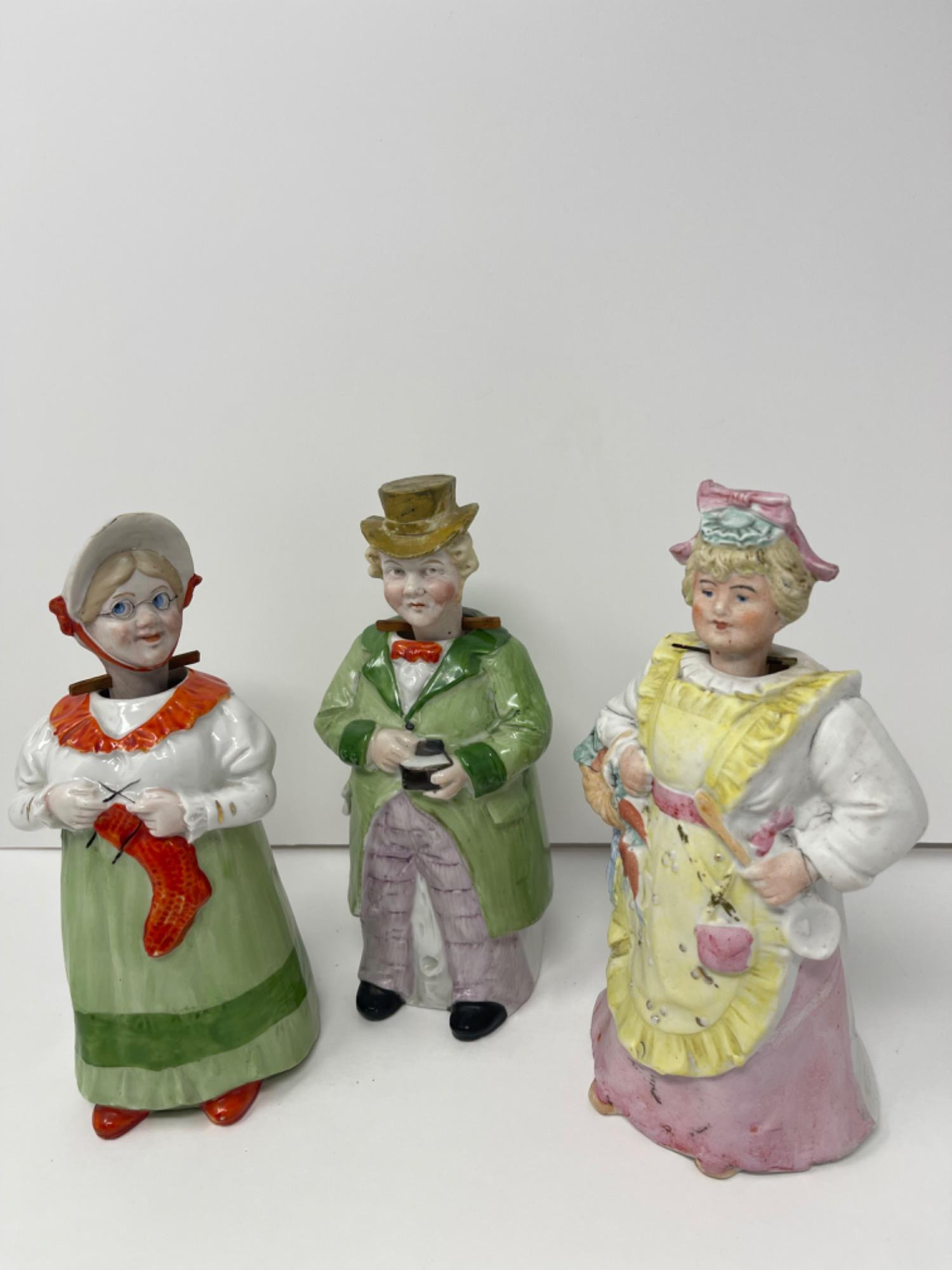 Item/s: Three ceramic nodder figurines, each approximately 7.5 x 4 inches. Takeaways: Materials: Painted ceramic. Features: Detailed period clothing, nodding heads. Uses: Decorative collectibles. History: These nodders likely date back to the late 19th or early 20th century, popular as novelty items representing caricatures of people from various walks of life.